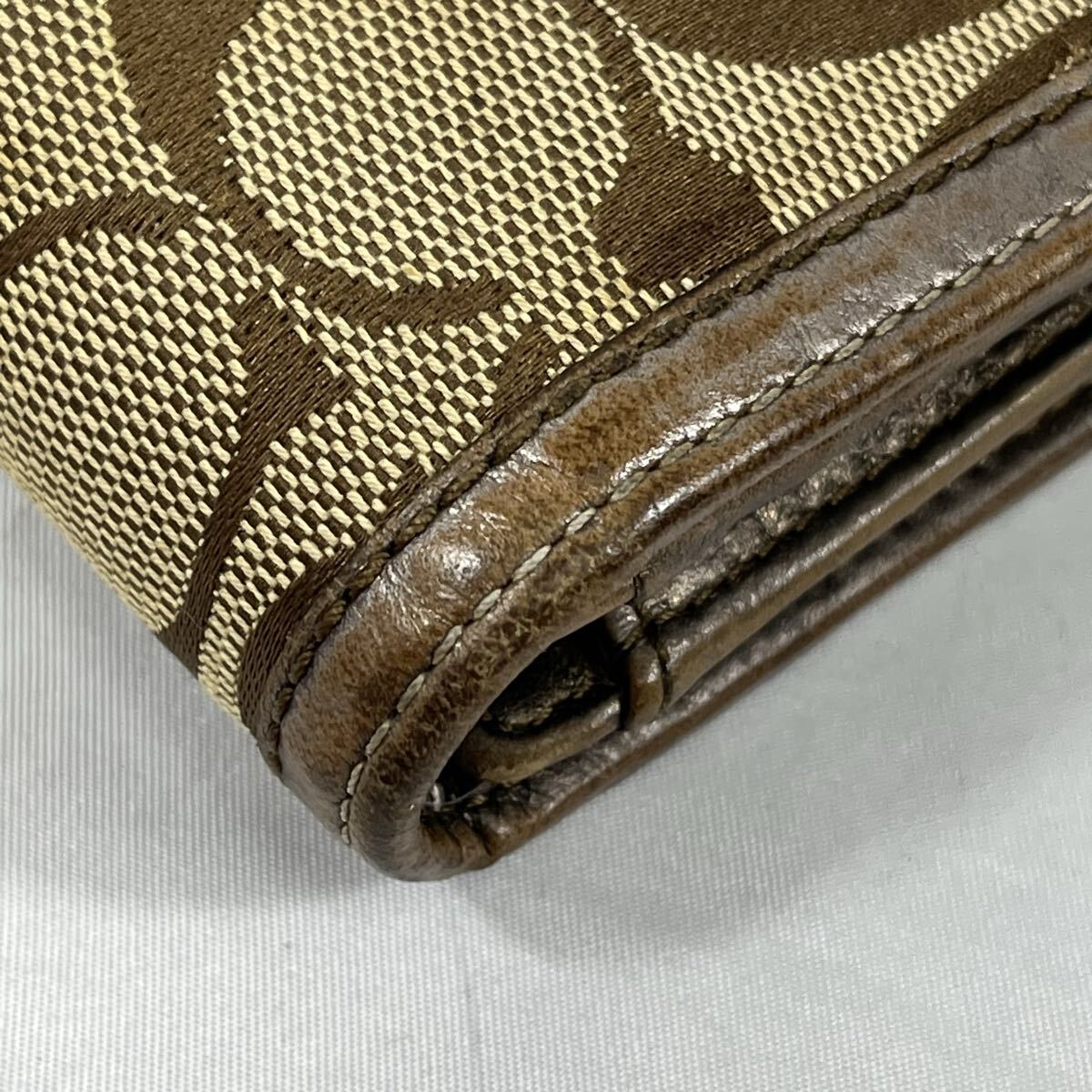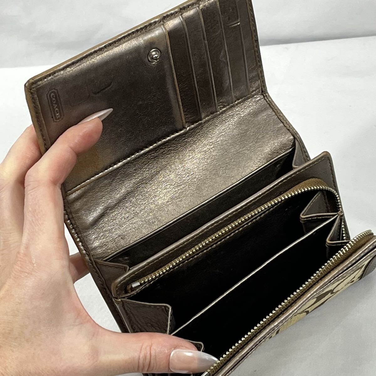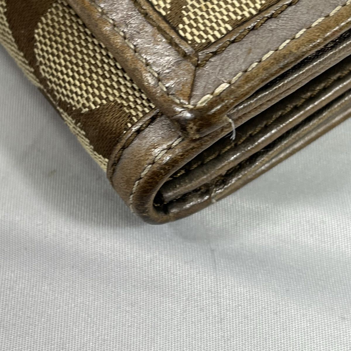・COACHのブラウン系 シグネチャーデザインの二つ折り財布。キャンバスとレザーのコンビネーションが特徴。