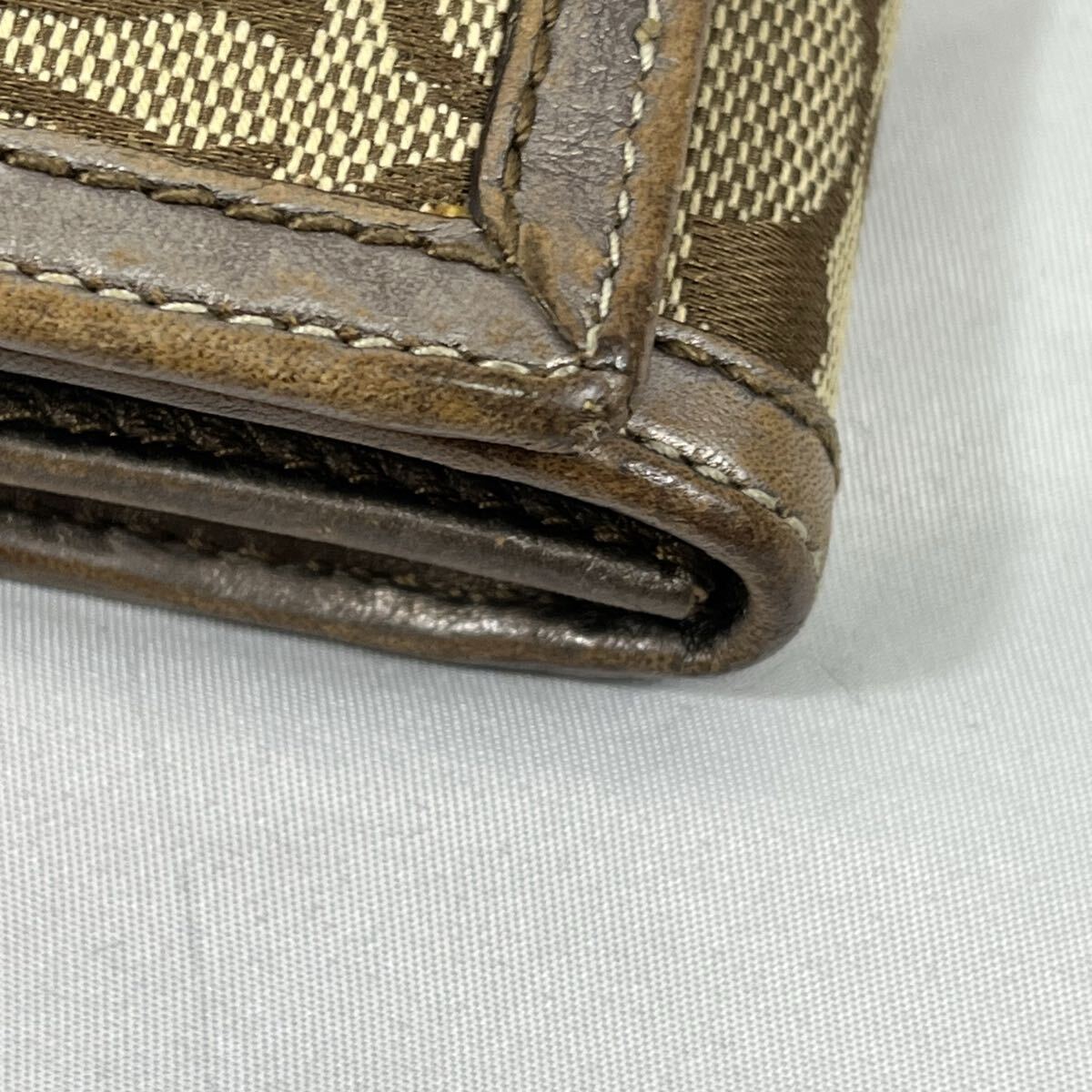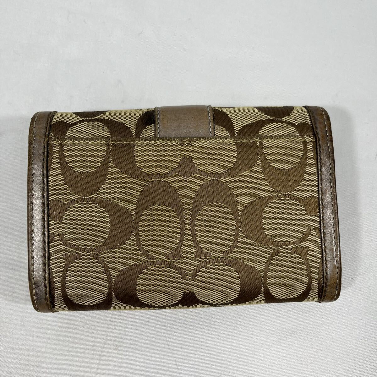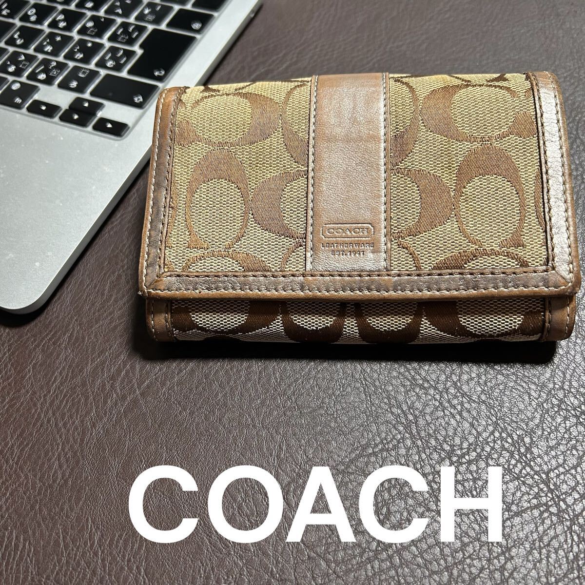 ・COACHのブラウン系 シグネチャーデザインの二つ折り財布。キャンバスとレザーのコンビネーションが特徴。