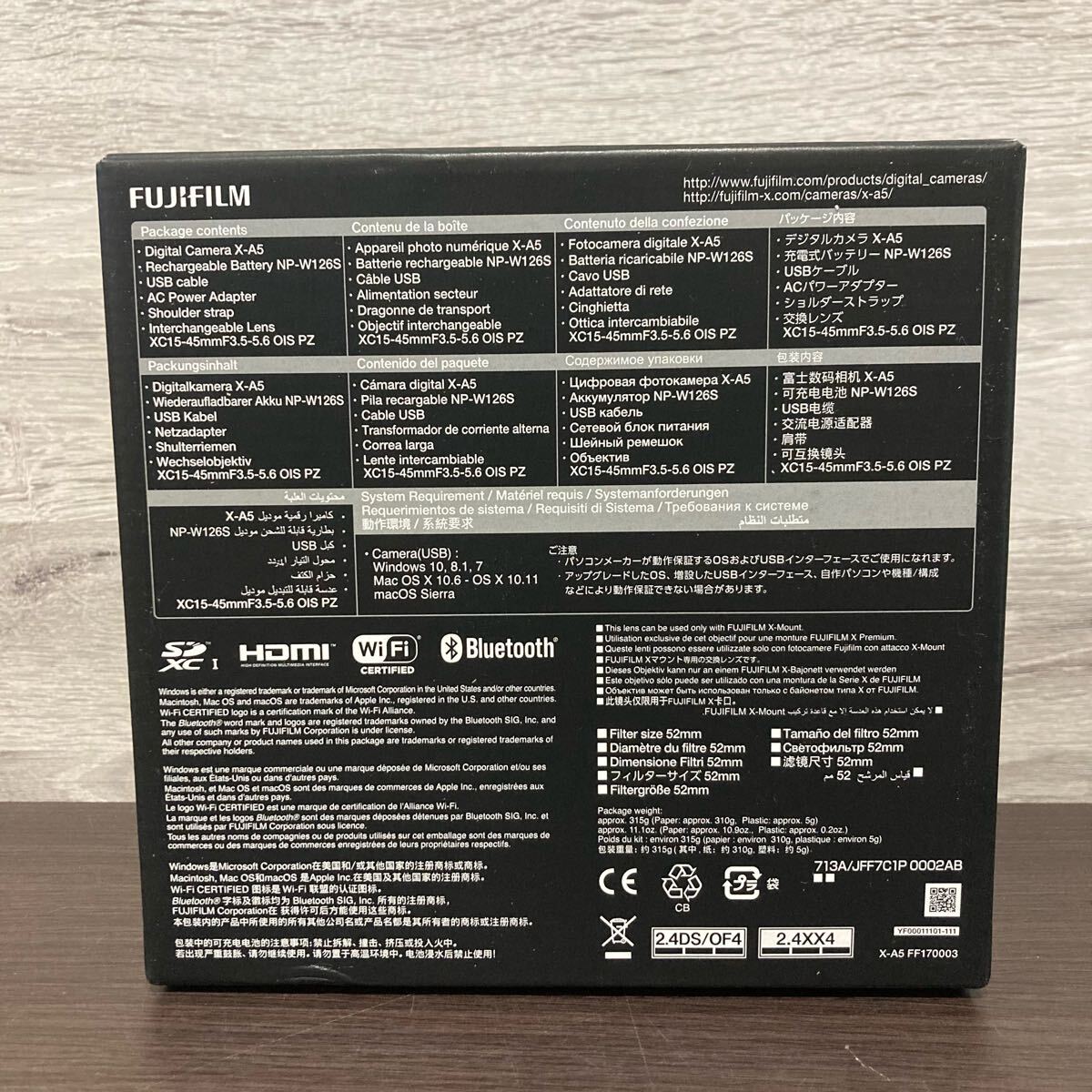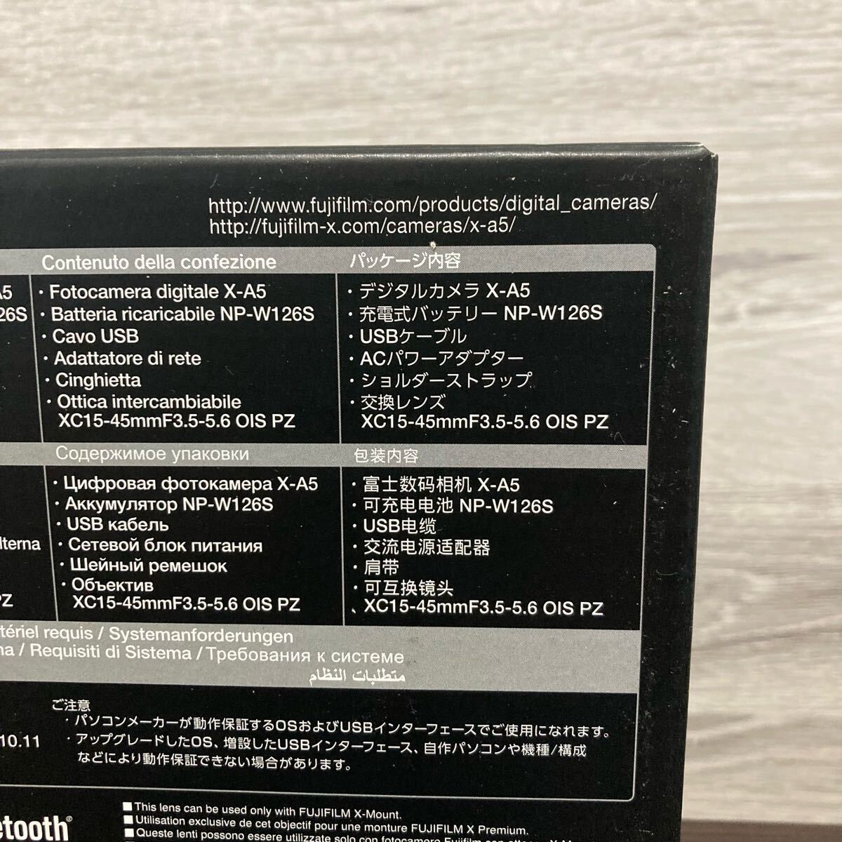 内容品: デジタルカメラX-A5、充電式バッテリーNP-W126S(リチウムイオンタイプ)、ACパワーアダプター、USBケーブル、ショルダーストラップ、交換レンズ(XC15-45mmF3.5-5.6 OIS PZ)