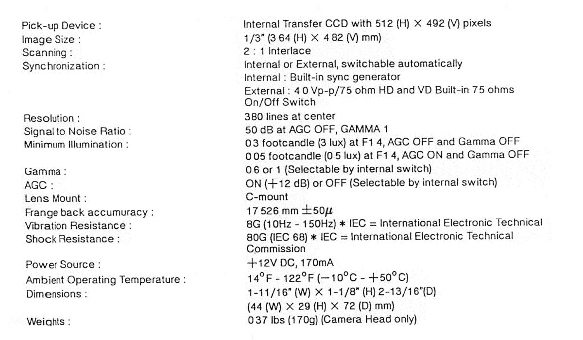 カメラ本体   29(H) x 44(W) x 72(D) mm  重さ 130g  電源 DC12V 170mA