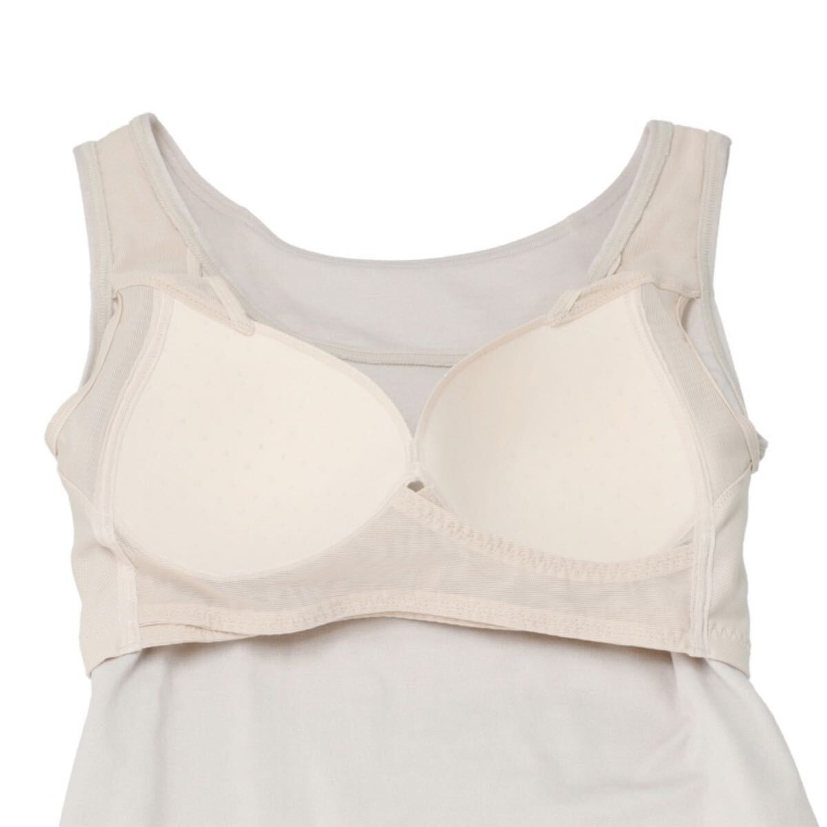 内蔵ブラの脇から後ろ身頃には、伸縮性・吸水速乾性のある旭化成“テクノファイン”を交編したツーウェイトリコットを使用。脇や背中の汗も素早く吸って乾きやすく、お洗濯も楽です
