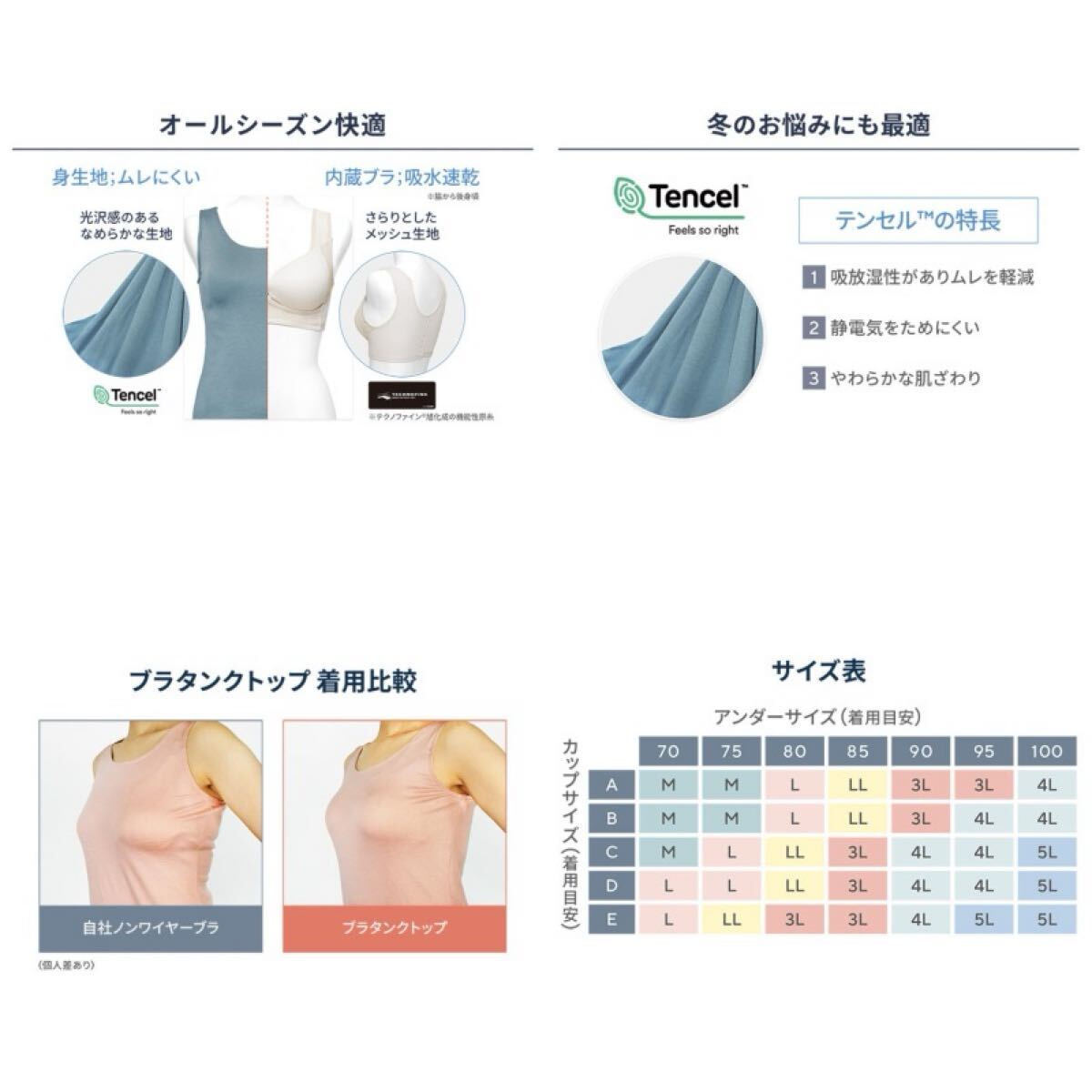 左右のバストを別々に支えるツインクロス構造で、動きやすくズレにくいブラタンクトップ。身生地にはレンチング社のTENCEL(TM)糸を混紡した天竺素材*を使用。やわらかな風合いで上品な光沢があり、なめらかな肌触りが魅力です