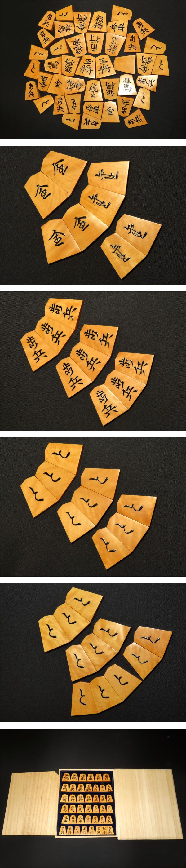 木地は御蔵島黄楊銀目(ぎんめ)。ご覧の通り味の良い木地です。全ての駒の表裏をUPしてございます。是非ご覧下さい。