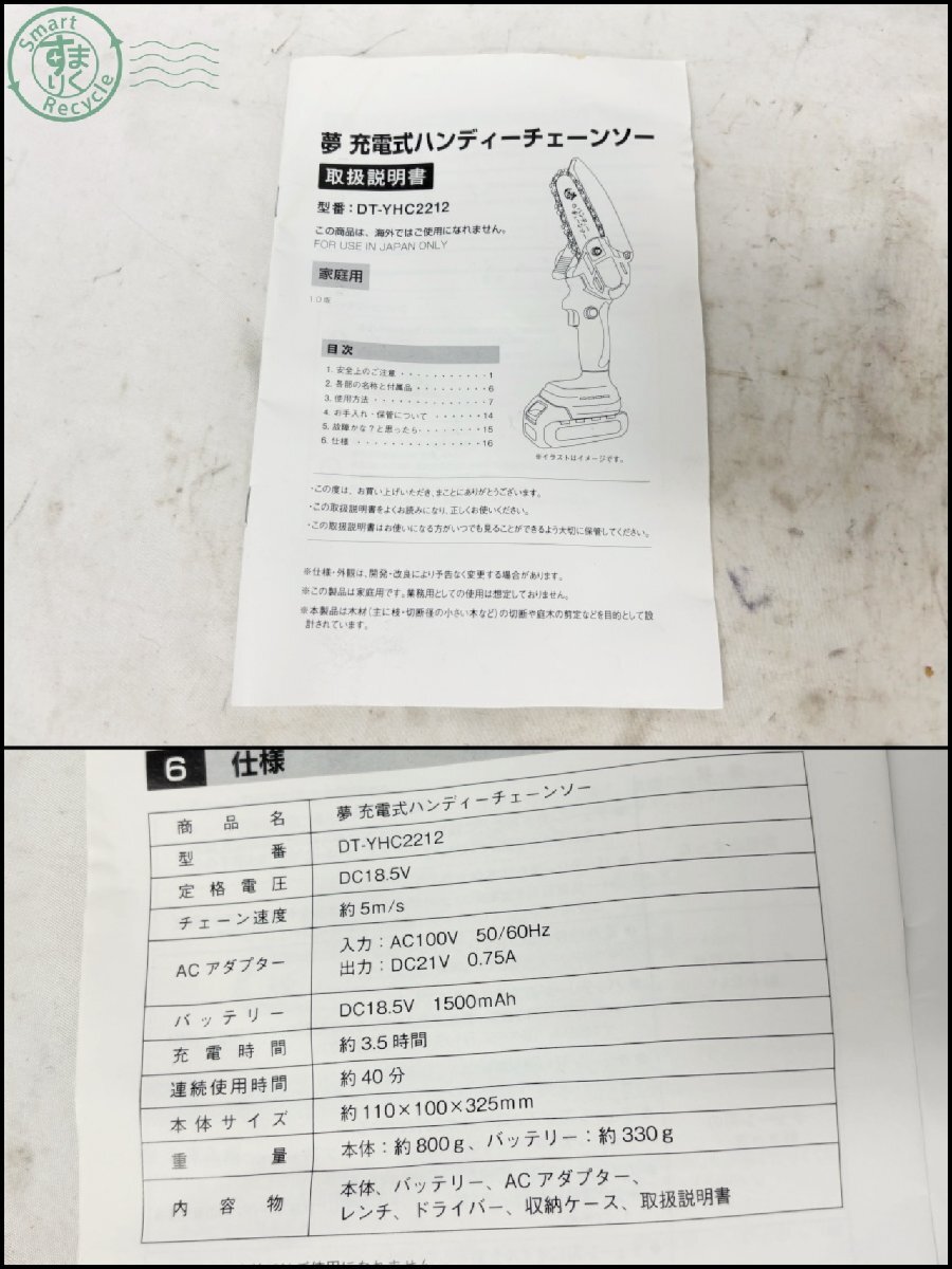 ▲ 夢グループ 充電式 ハンディ チェーンソー DT-YHC2212 小型 切断機 電動 工具 家庭用 ケース 説明書 中古 通電可能 現状品 | |||