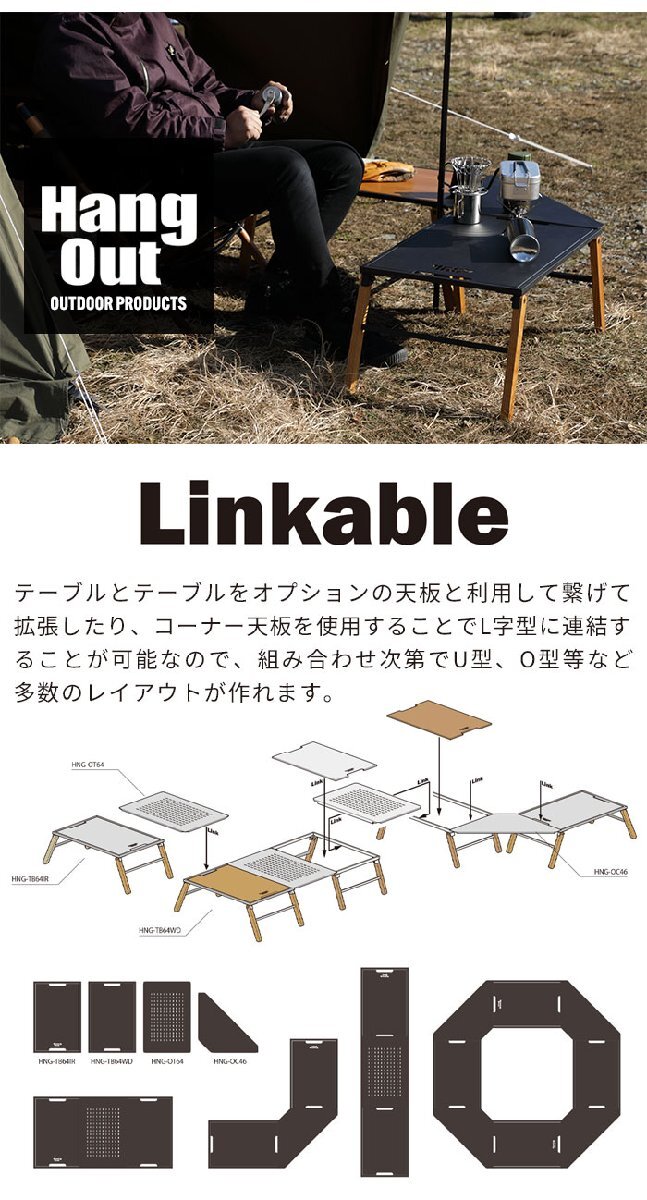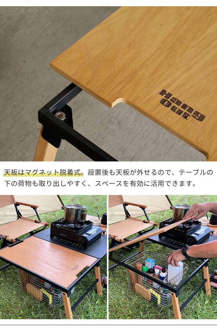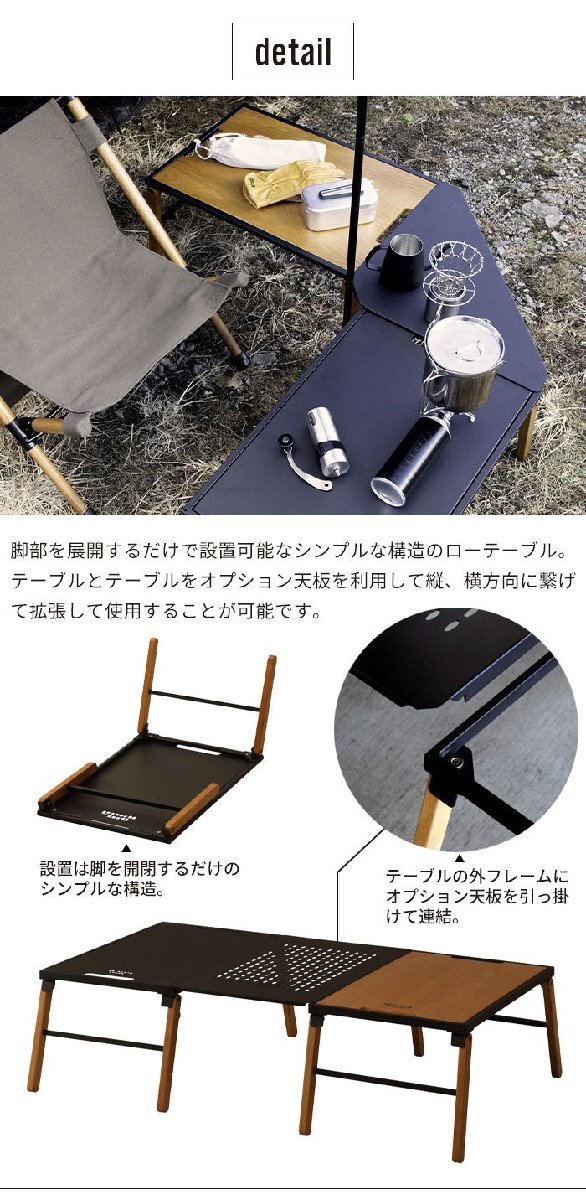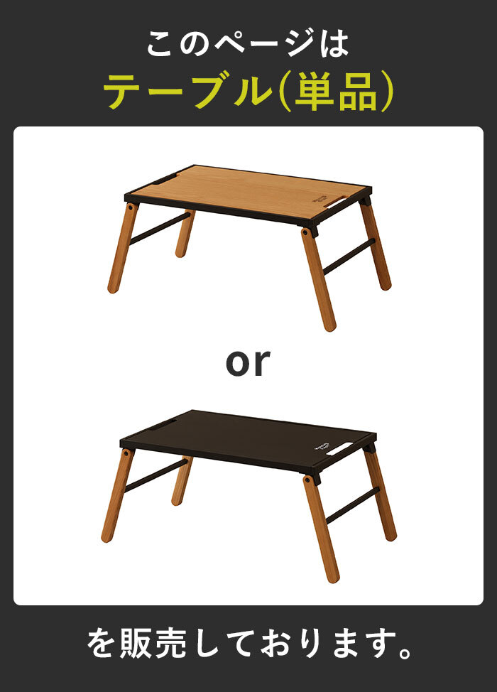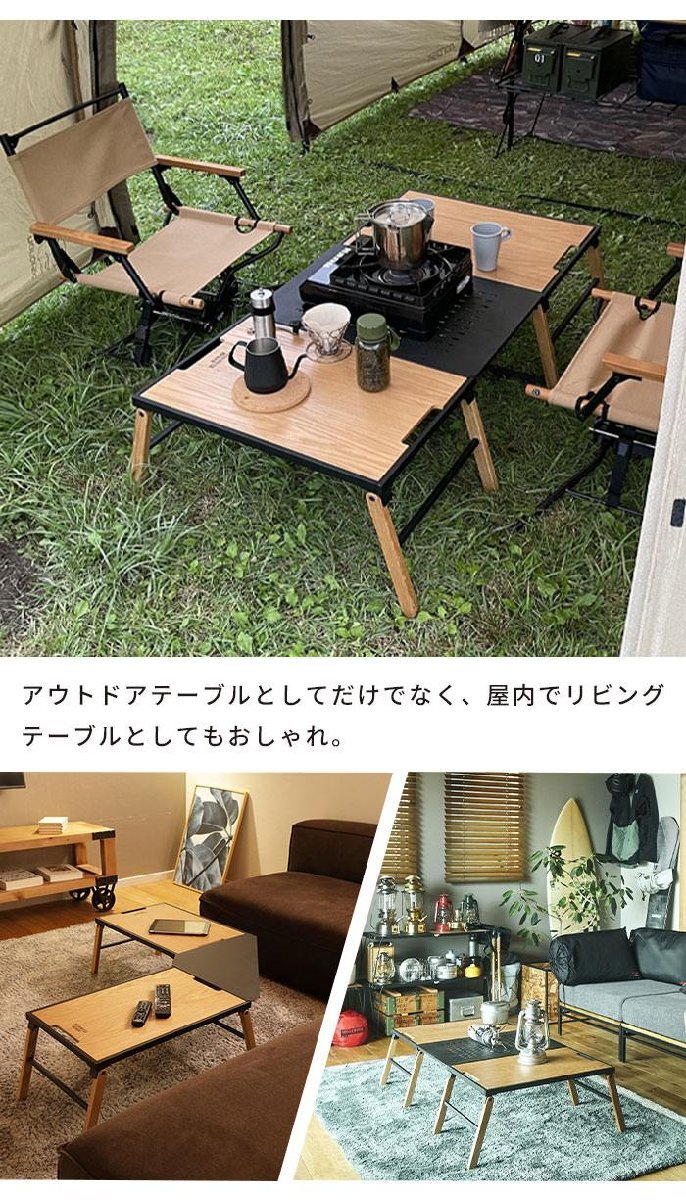 ソロからファミリー、大人数向けなど幅広く使い方ができる拡張テーブルシリーズ。 脚部を展開するだけで設置可能なシンプルな構造のテーブルはウッドとアイアンの2種類の天板があります。 ウッドは表面にPU(ウレタン)塗装を施してあり、傷つきにくくお手入れも簡単。 アイアンは表面にチッピング塗装を施してあるため、ザラザラとした質感に仕上がりになっています。 デザイン性の高いアウトドアテーブルなので、テーブル単品での使用はもちろん、別売りのオプション天板を繋げて組み合わせることで、多彩なレイアウトが楽しめます。 アウトドアテーブルとしてだけでなく、屋内でリビングテーブルとしてもおしゃれ。 ※こちらのページは、「テーブル(単品)のみ」の販売ページです。 |