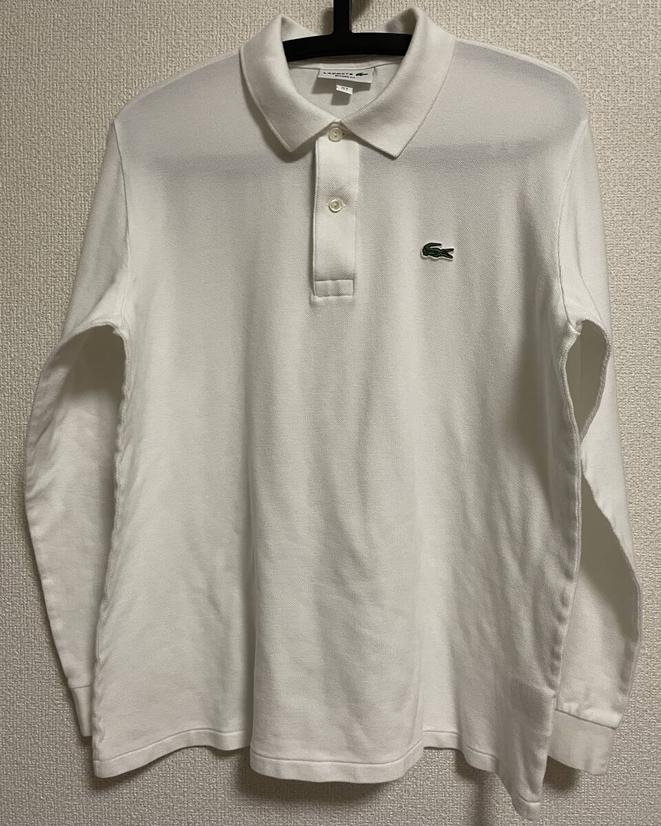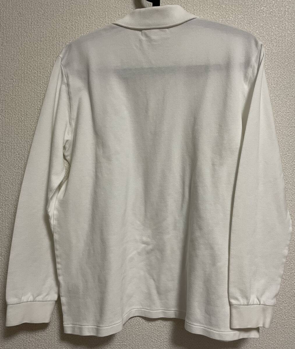 定番長袖ポロシャツのL1213です。色は白でサイズは5です。平置きで肩幅48cm身幅54cm袖丈54cw着丈64cmです。素人採寸につき誤差はご了承ください。目立つ汚れや傷等もない美品ですが中古の旨をご理解いただき写真でご判断ください。よろしくお願いします。