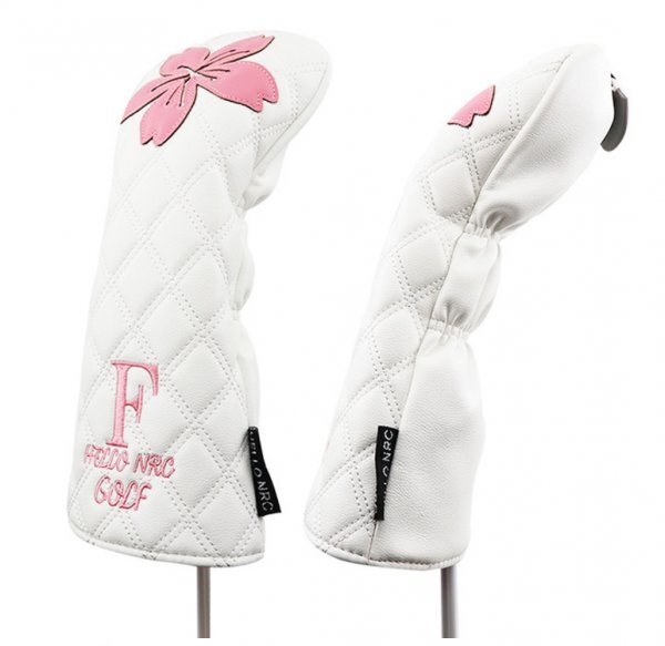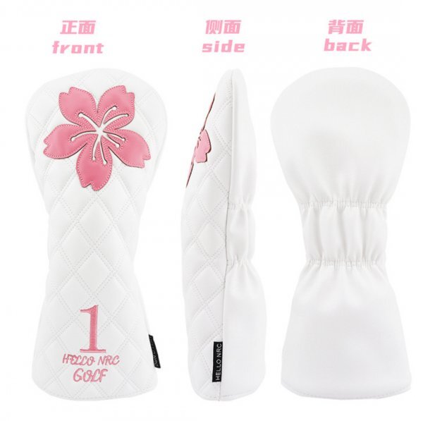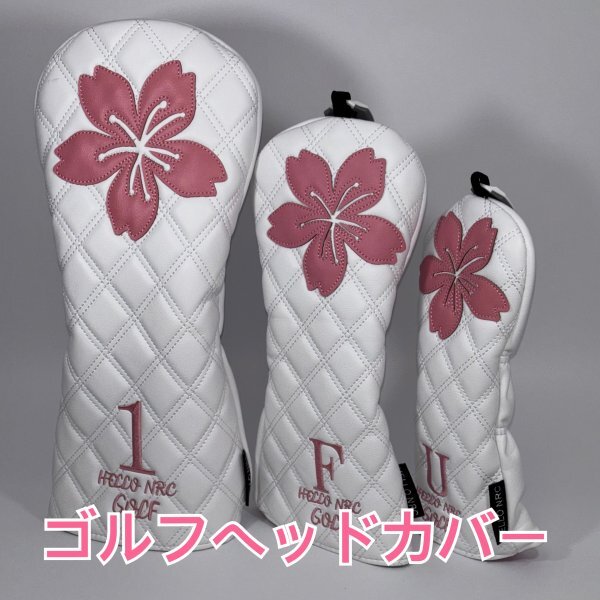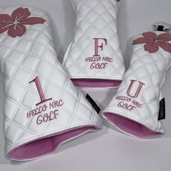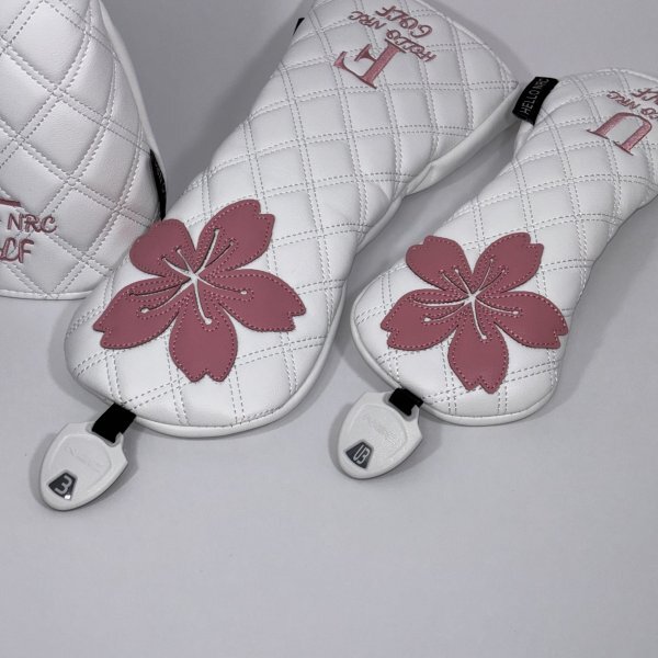 桜の花デザインのホワイトとピンクのゴルフヘッドカバー、1番ウッド用、フェアウェイウッド用、ユーティリティ用の三個セット。素材の質感が高く、品のあるヘッドカバーです。