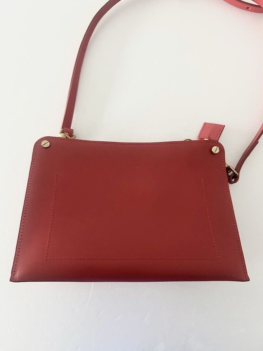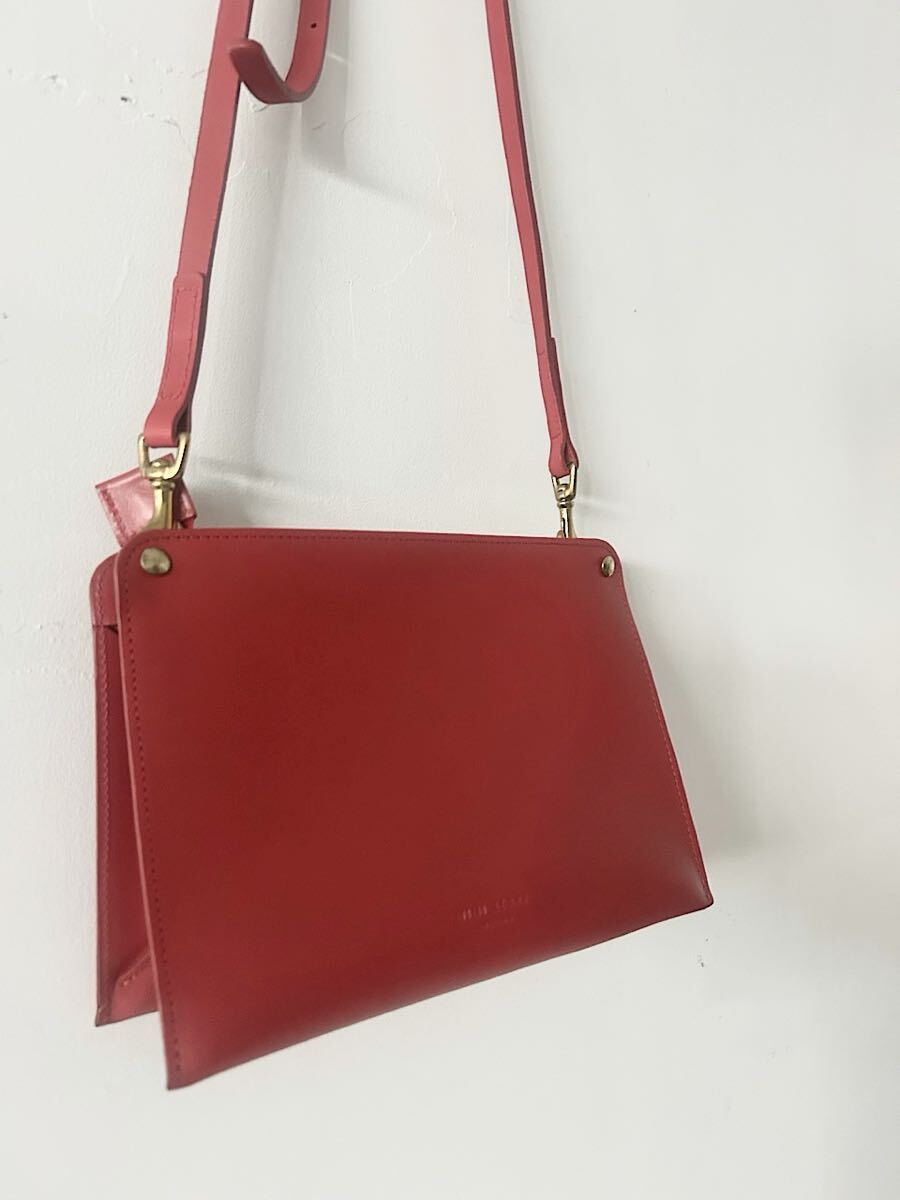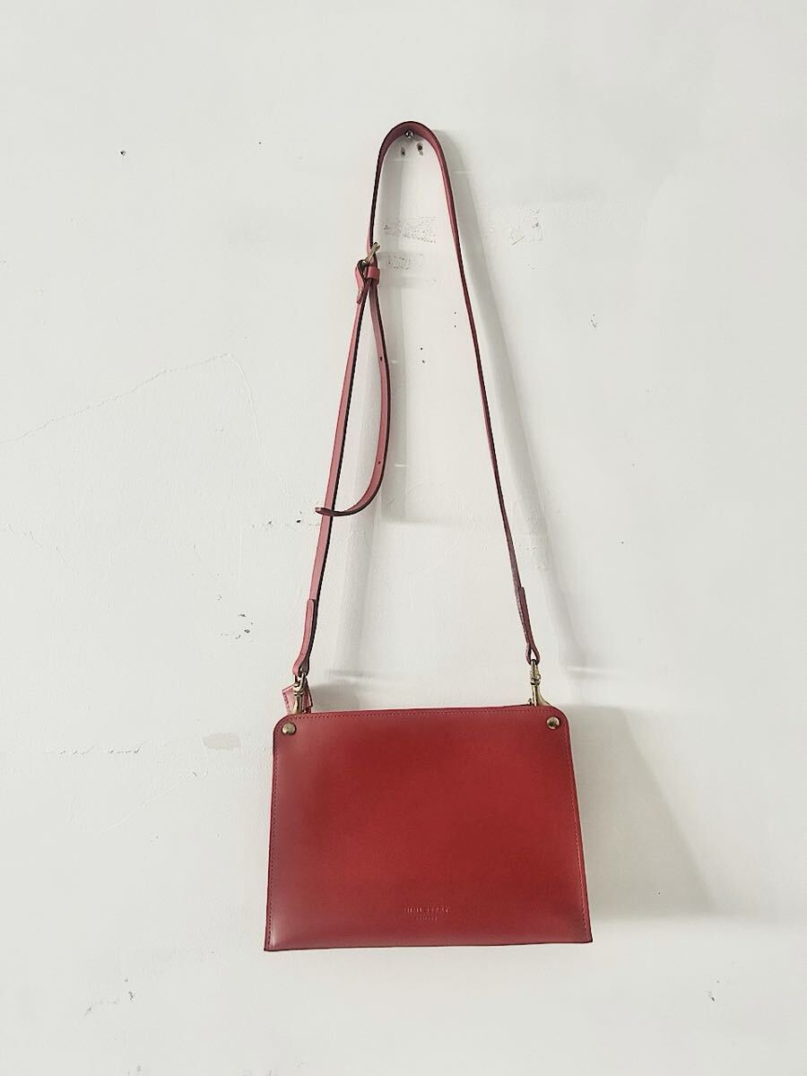 カラーはスカーレット(あざやかな黄みの赤色)で牛革素材のショルダーバッグです。