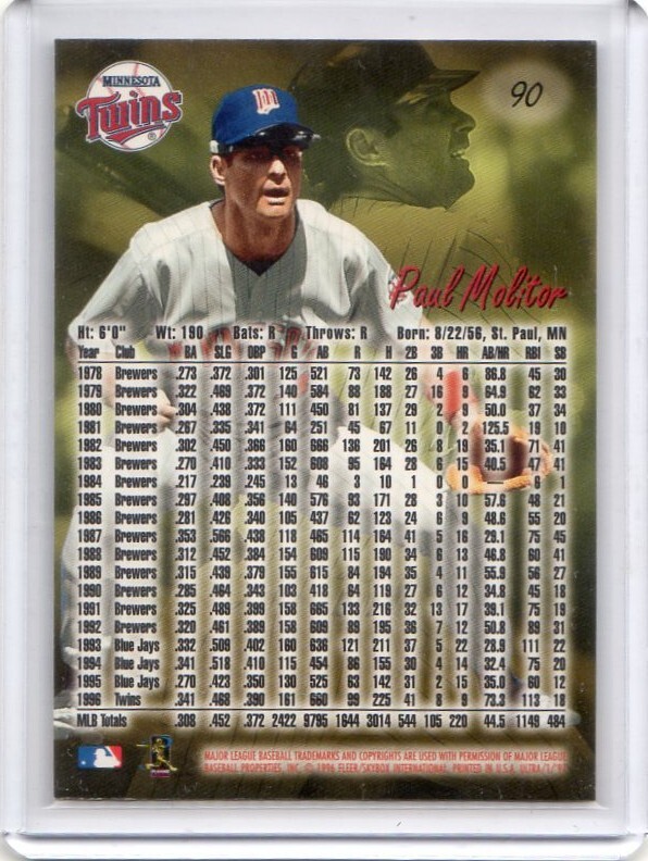 1997FLEER ULTRA #90 ------------------------------------------------------------ ■ポール・モリター MLB成績 21年 1978-98年 ブルワーズ ブルージェイズ ツインズ 2683試合 3319安打 234本塁打 1307打点 504盗塁 打率.306 最多安打3回 得点王3回 オールスター7回 2004年殿堂入り モリター・ファンの方、是非どうぞ! |