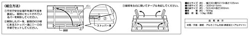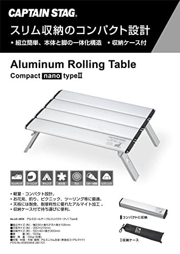 「商品情報」スリム収納のコンパクト設計。組立簡単、本体と脚の一体化構造。収納ケース付き。軽量・コンパクト設計。お花見、釣り、ピクニック、ツーリング等に最適。天板には耐食、耐摩耗性に優れたアルマイト加工。収納ケース付きで持ち運びに便利。「主な仕様」組立サイズ:(約)幅330×奥行215×高さ105mm、天板サイズ:(約)300×215mm収納サイズ:(約)50×40×長さ300mm製品重量:(約)500g耐荷重:10kg(均等)材質:天板・脚部/アルミニウム合金(表面加工=アルマイト)、原産国:中国