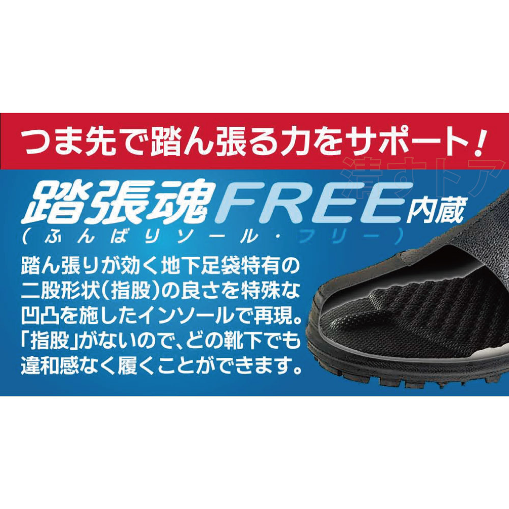指股がない地下足袋を意識した特殊形状のインソールがブレを抑え、踏ん張る力をサポート。足股がなく、どの靴下にも対応するので履き合せ自由です。