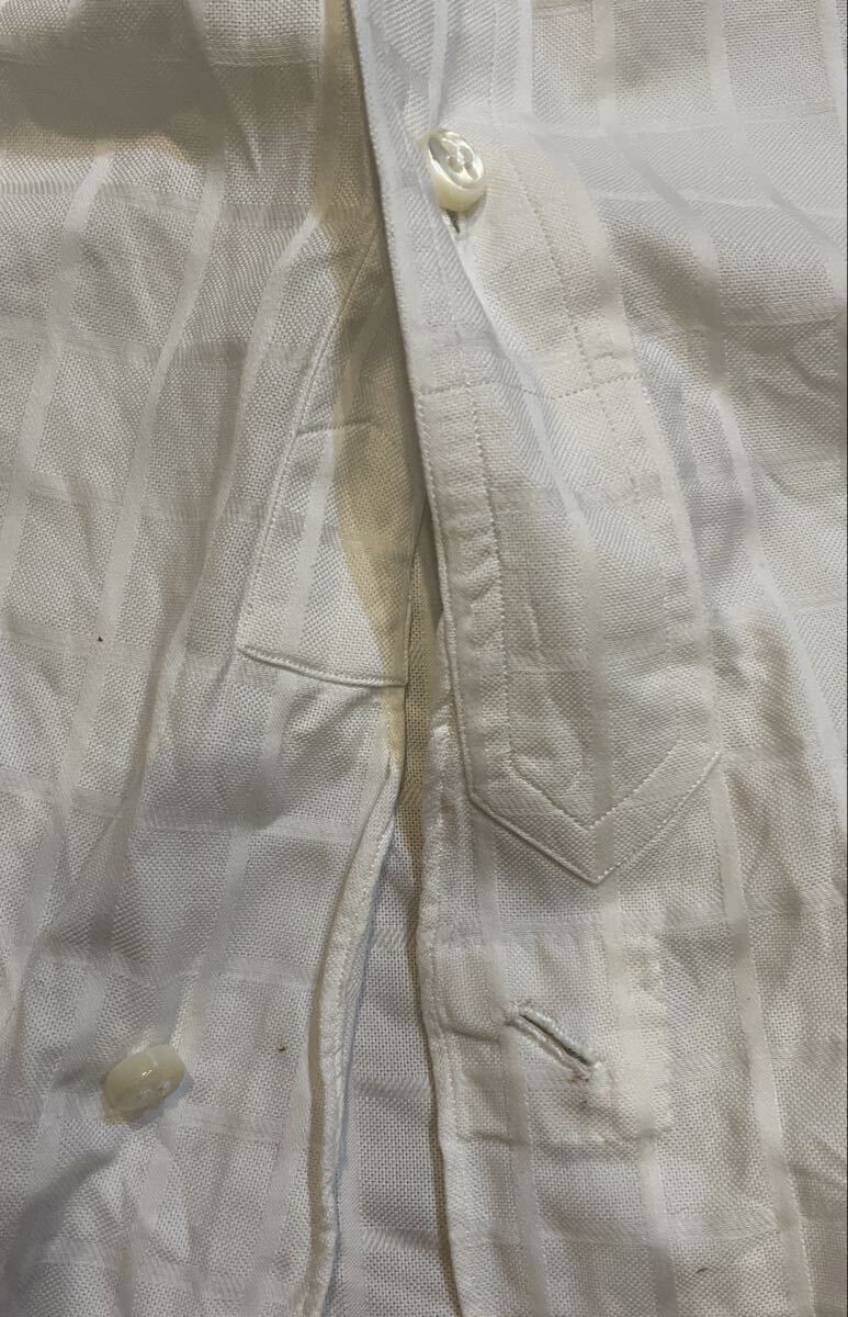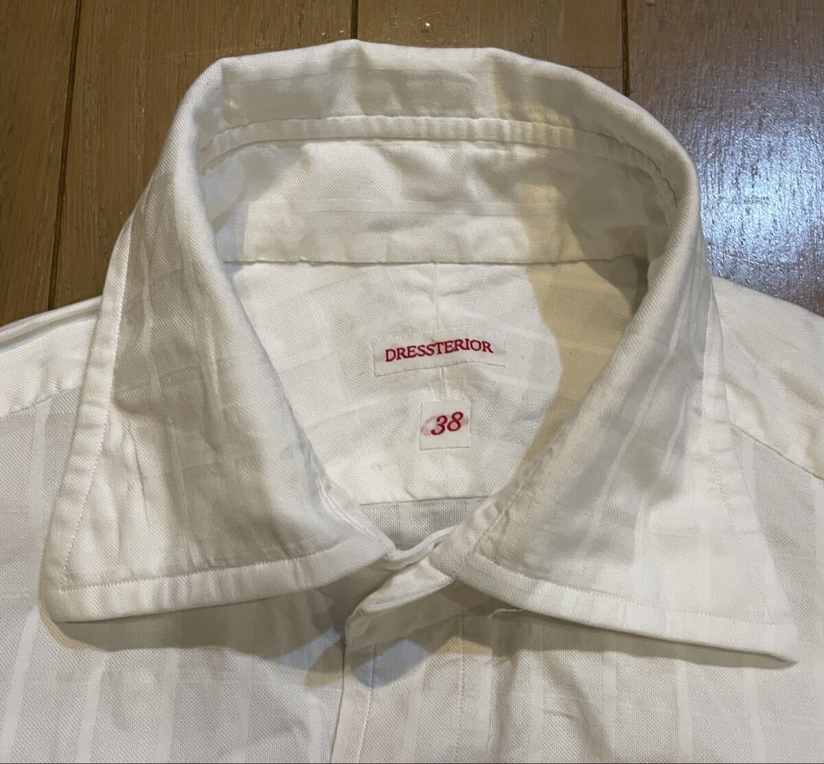 ドレステリアシャツです。身頃の型、襟の型、刺繍入りのマチ等こだわりが満載です。カラーはホワイトです。表記サイズは38、実寸は肩幅43cm、身幅約52cm、着丈77cm、袖丈約525cm(脇下から)です。素人採寸につき、多少の誤差はご了承願います。使用感、薄シミ等ございますが、目立つダメージはございません。7点/10でしょうか。あくまで長期保管品です。見落としがあることもございますので、細かい点を気になさる方からの入札はお断りさせていただきます。発送は本州であれば650円で可能です。レターパックも可能です。落札後のキャンセルは一切お断りさせていただきますので、ご不明な点等はご質問下さいませ。