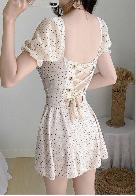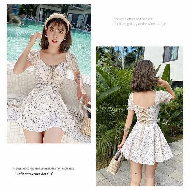 小胸バンドゥ 体型カバー 水着 可愛い スイムウェア ワンピース型 ショートパンツ水着2点セット韓国風 米色 L