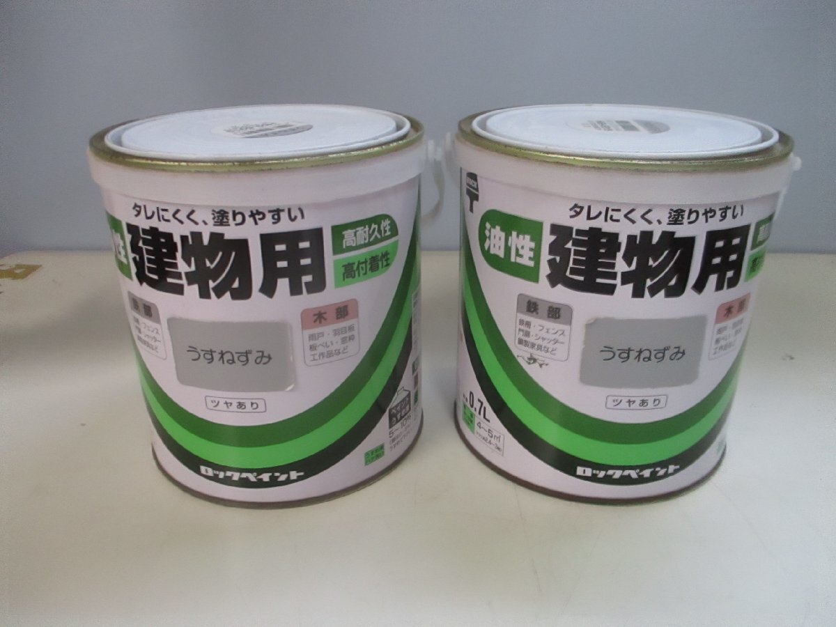 ロックペイント 油性 建物用・0.7L×2缶 商品詳細 【塗り面積(2回塗り)】4~5m2(タタミ約 2.4~3枚) 【乾燥時間】夏 6~8時間 冬 18~24時間 【塗り重ね可能時間】 塗り重ねる時は20℃で20時間以上、10℃で40時間以上乾かしてください。 【うすめ方】 塗料の粘度が高く塗りにくい時は、ペイントうすめ液で少しうすめてください (5~10%が目安です・銀は0~5%) 【用途】 (門扉、シャッター、物置、ロッカー・羽目板、戸袋、板塀、窓ワク、ドア 手すり、さん、工作品など。) ただし、高級家具、テーブルおよび床面を除く。 【特長】 ・ハケ伸びが良く、塗りやすいツヤありの塗料です。 ・タレが少なくインペイ性にすぐれてます。 ・ハケ目がたたず、美しい仕上がりで、耐久性付着性にすぐれてます。 ・有害な鉛、クロム系の化合物を原料として使用していません。 高耐久性・高付着性 合成樹脂調合ペイント・つやあり 特価品のため、缶にサビ・凹み・傷がある場合があります。 ★出品中の商品は、店頭でも販売しております。 店頭で売れた場合には期日に関わらずオークションを早期終了させていだきます (ご入札があった商品は直ちに店頭からお下げしておりますが、稀に入れ違いで売れてしまう場合もございます。ご了承くださいませ) 当社のオークションは返品・交換・キャンセル等は一切お断りさせて頂いております。充分ご検討の上ご入札下さいませ。 | |