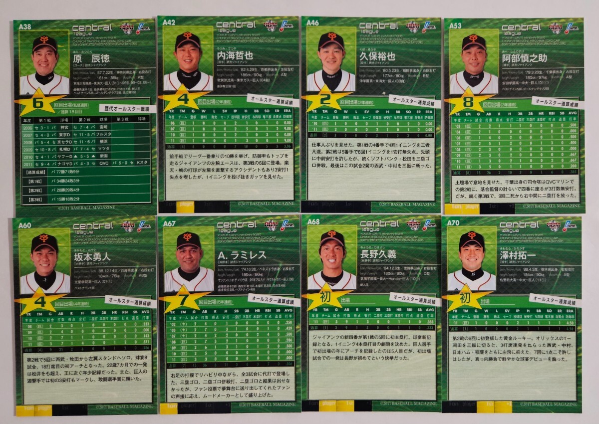2011年BBM オールスターカード 巨人8枚セット 内海哲也、阿部慎之助、坂本勇人、長野久義