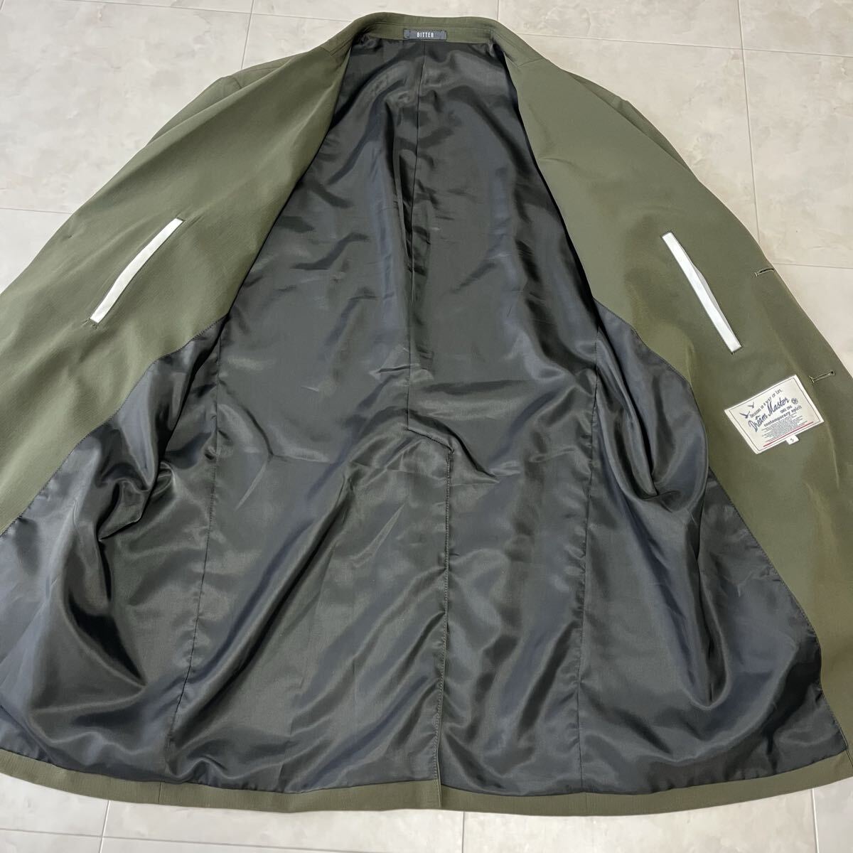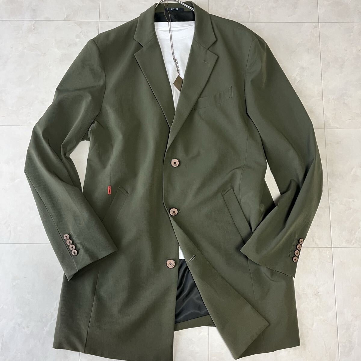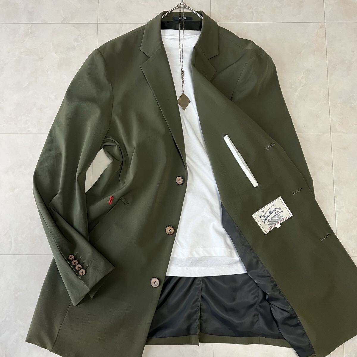 BITTERとDream Masterのコラボモデル。上品なカーキカラーと軽やかなナイロン素材で、春秋の羽織りとして活躍する美品ステンカラーコートです。撥水性のある生地とすっきりしたシルエットが特徴で、カジュアルにもビジネスにも対応します。