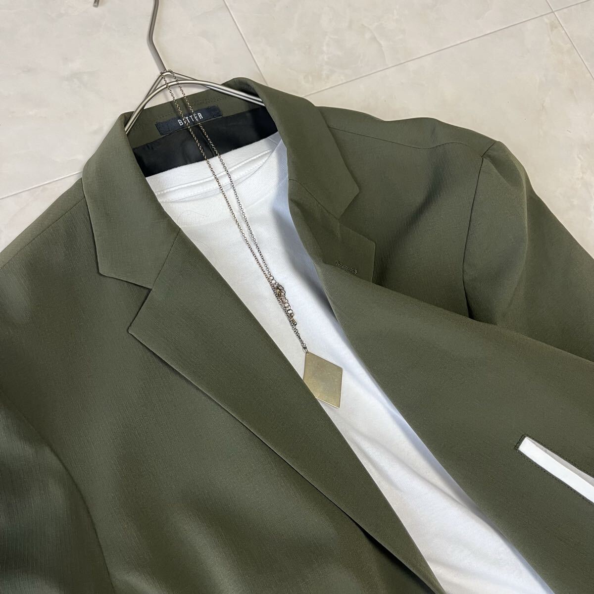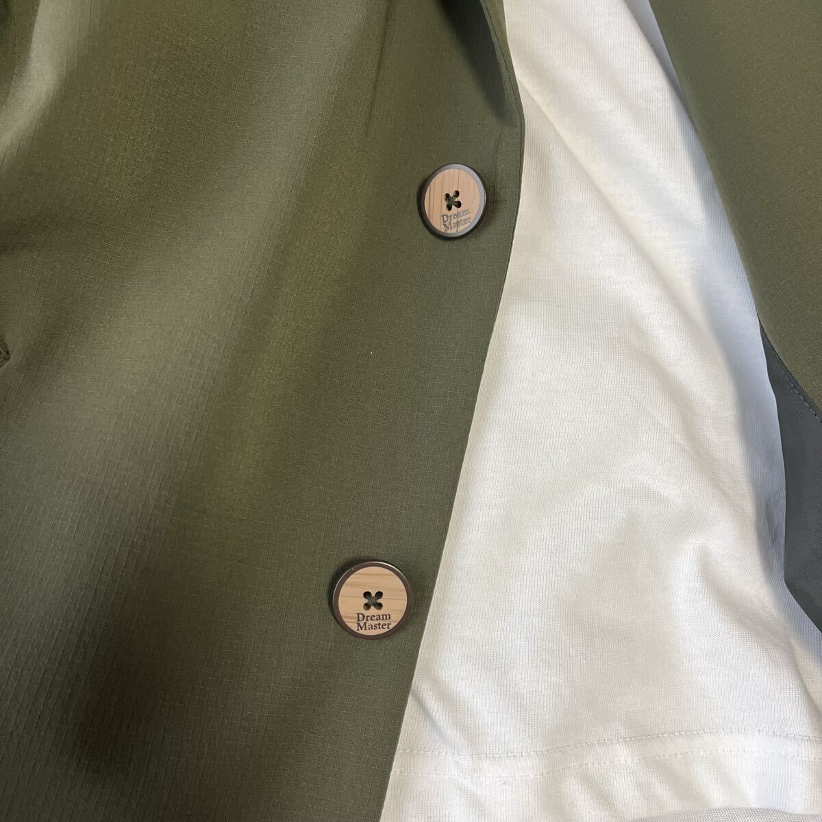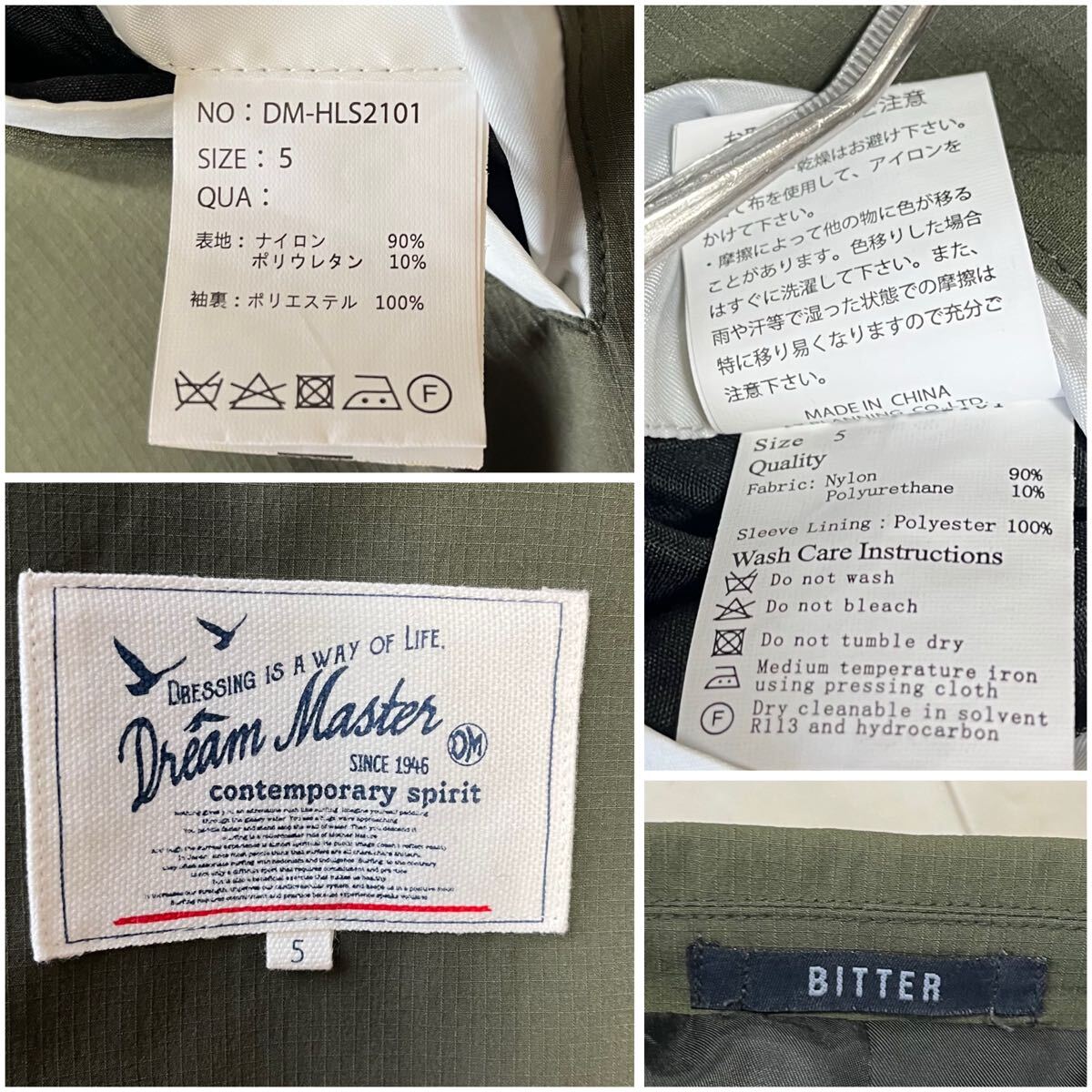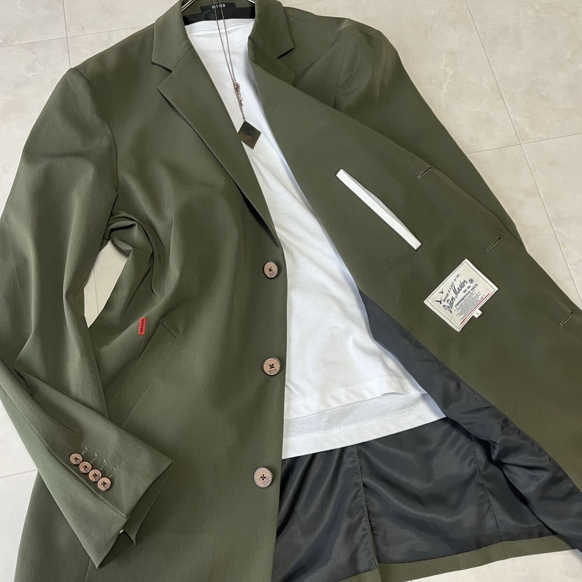 BITTERとDream Masterのコラボモデル。上品なカーキカラーと軽やかなナイロン素材で、春秋の羽織りとして活躍する美品ステンカラーコートです。撥水性のある生地とすっきりしたシルエットが特徴で、カジュアルにもビジネスにも対応します。
