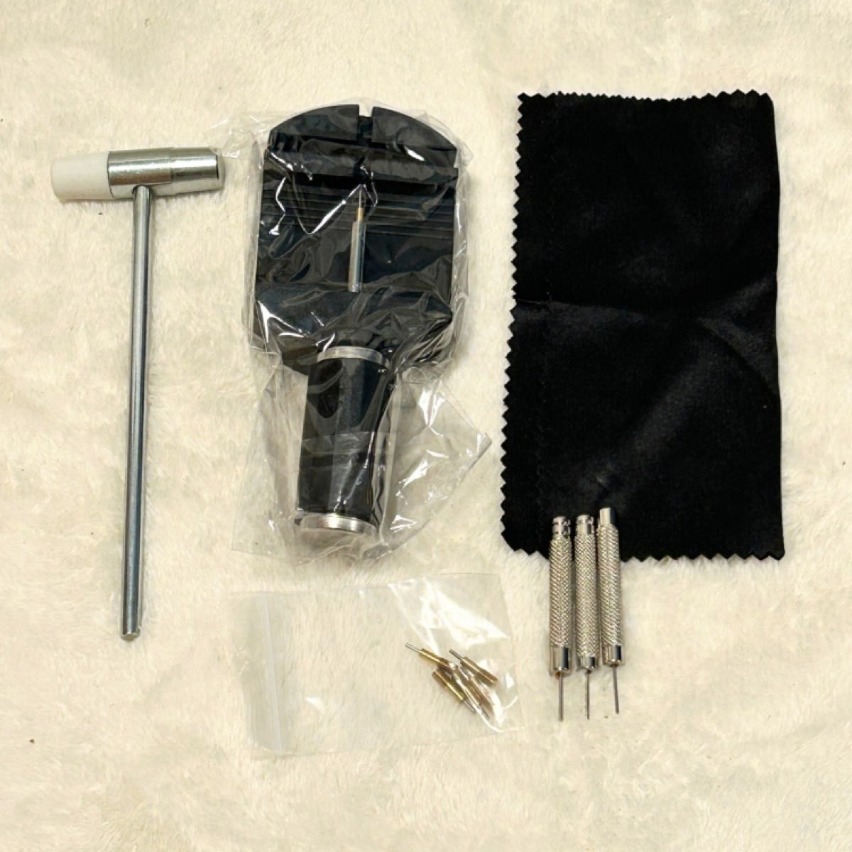 セットには、ベルト調整に必要なハンマー、ピン抜き、そして交換ピンが含まれています。