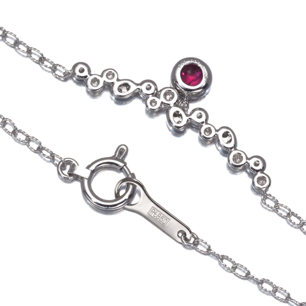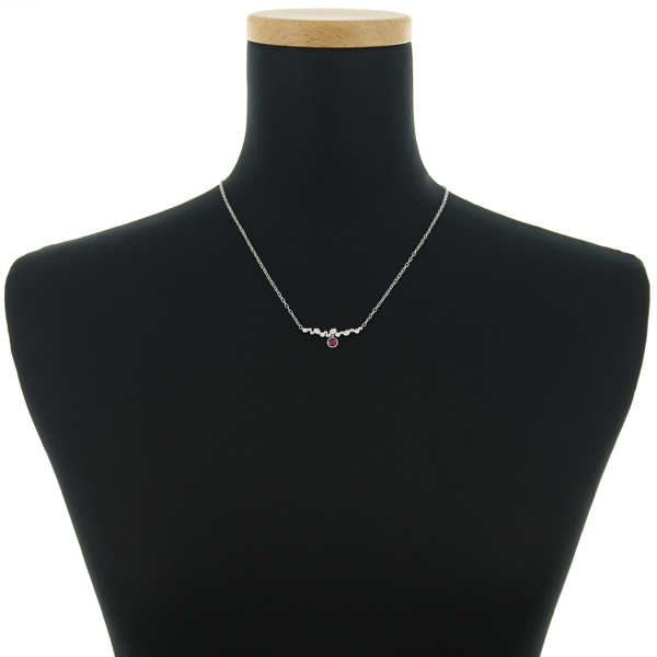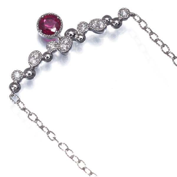 繊細なミルグレイン細工に包み込まれたダイヤモンドの瑞々しさにいっそう引き立てられたピンキッシュレッドのルビーが揺れ煌めく素敵なネックレス。装いの胸元を上品に彩ります。 |