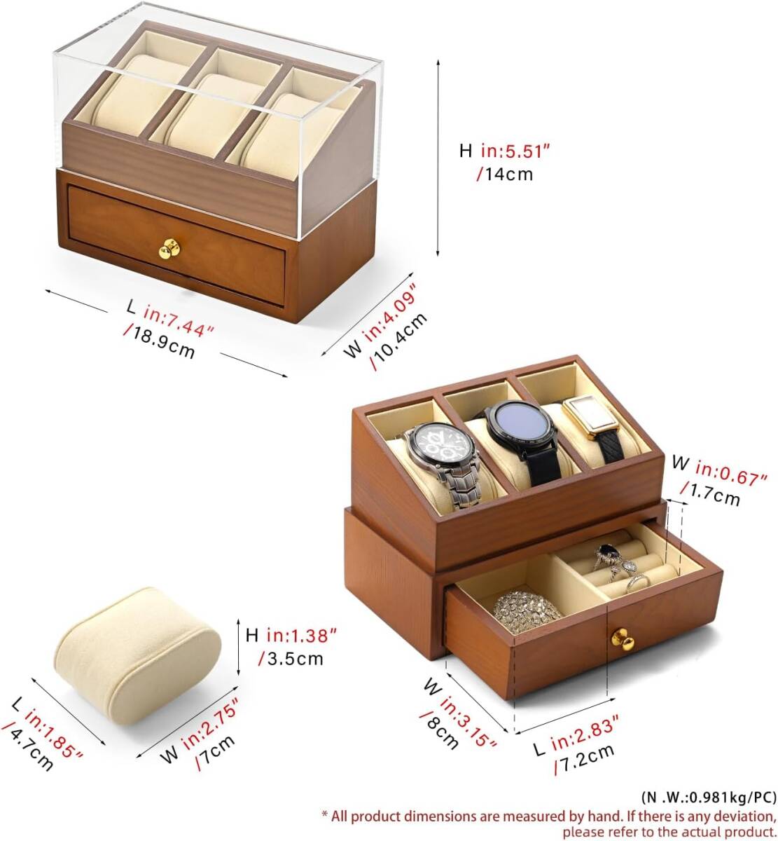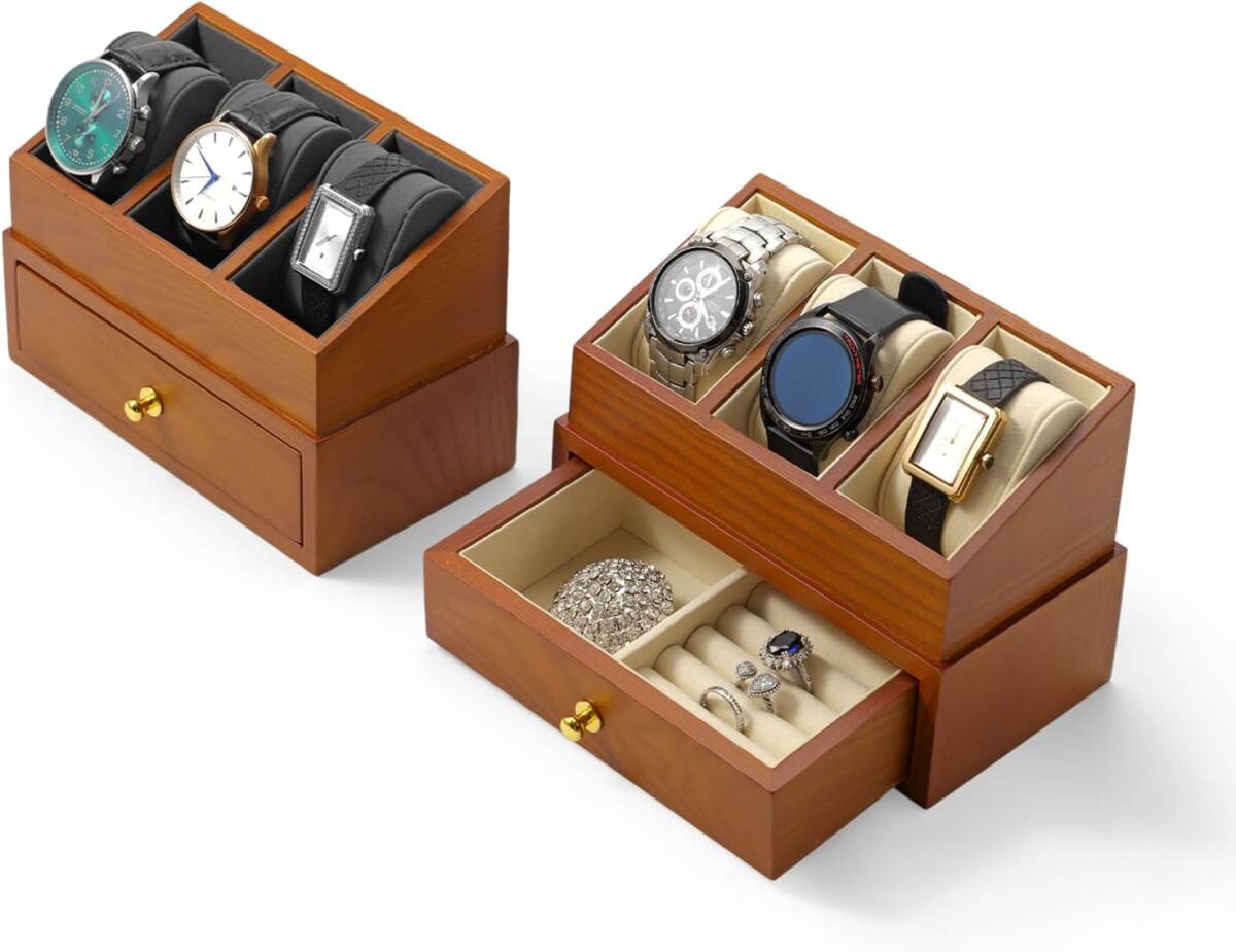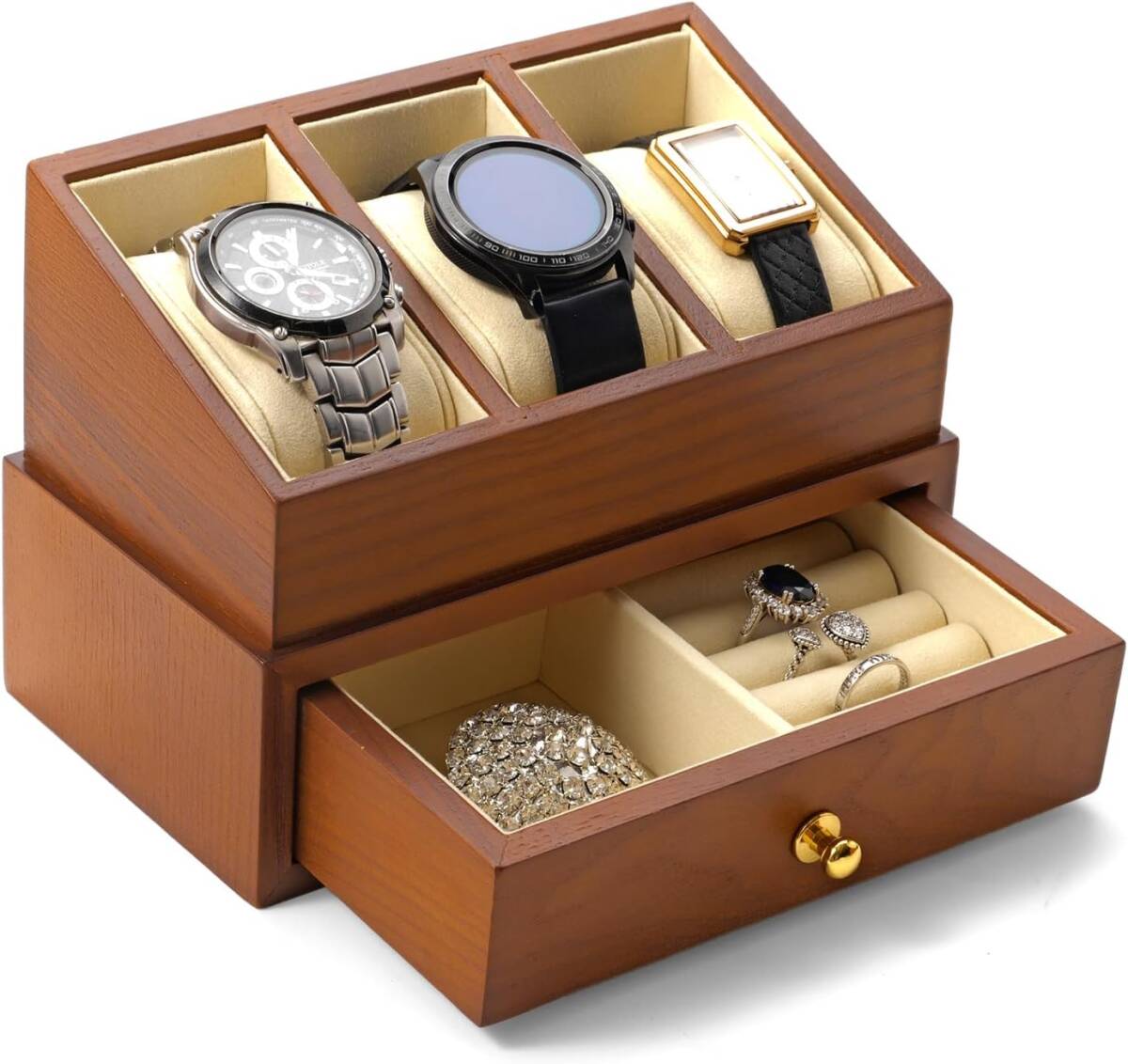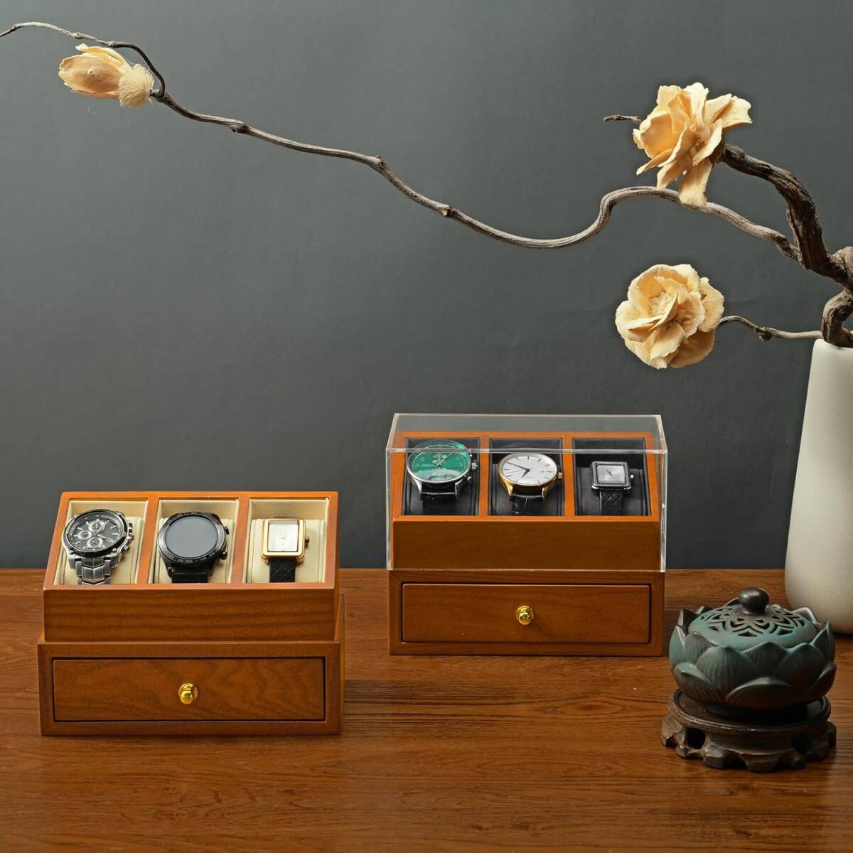 腕時計ケース 時計収納ボックス ベージュ 木製 腕時計3本収納可能 アクセサリー収納 2段式 引き出し付き 持ち運び おしゃれ コンパクト