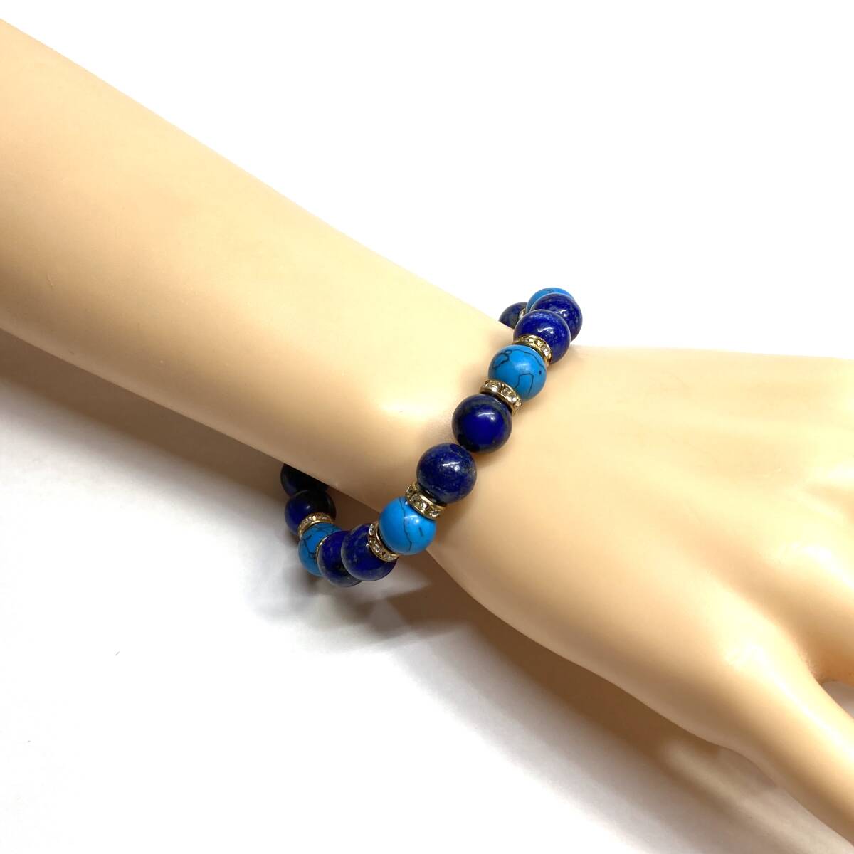 こちらは、ラピスラズリとターコイズを組み合わせたパワーストーンブレスレットです。間にはロンデルを挟み高級感あるデザインに仕上げております。石大きさは腕にも馴染みやすいように10mm玉で内径約18cm(伸可能)です。(サイズ変更の場合は取引ナビにてご連絡をお願いします。) 数に限りがございますので気になる方はお早めにどうぞ。