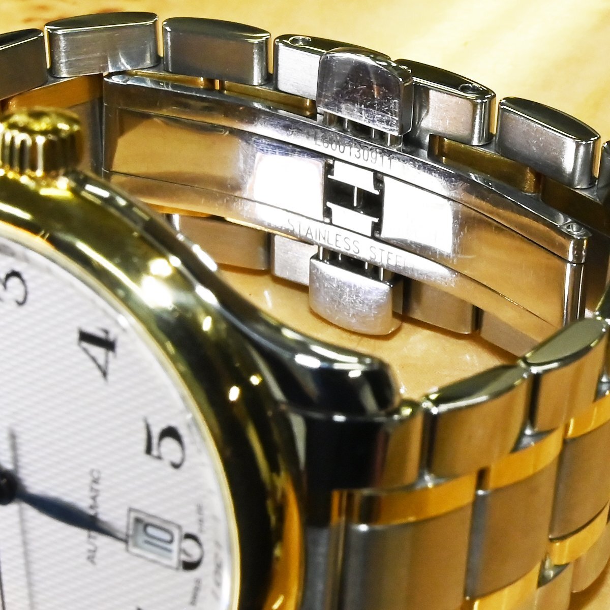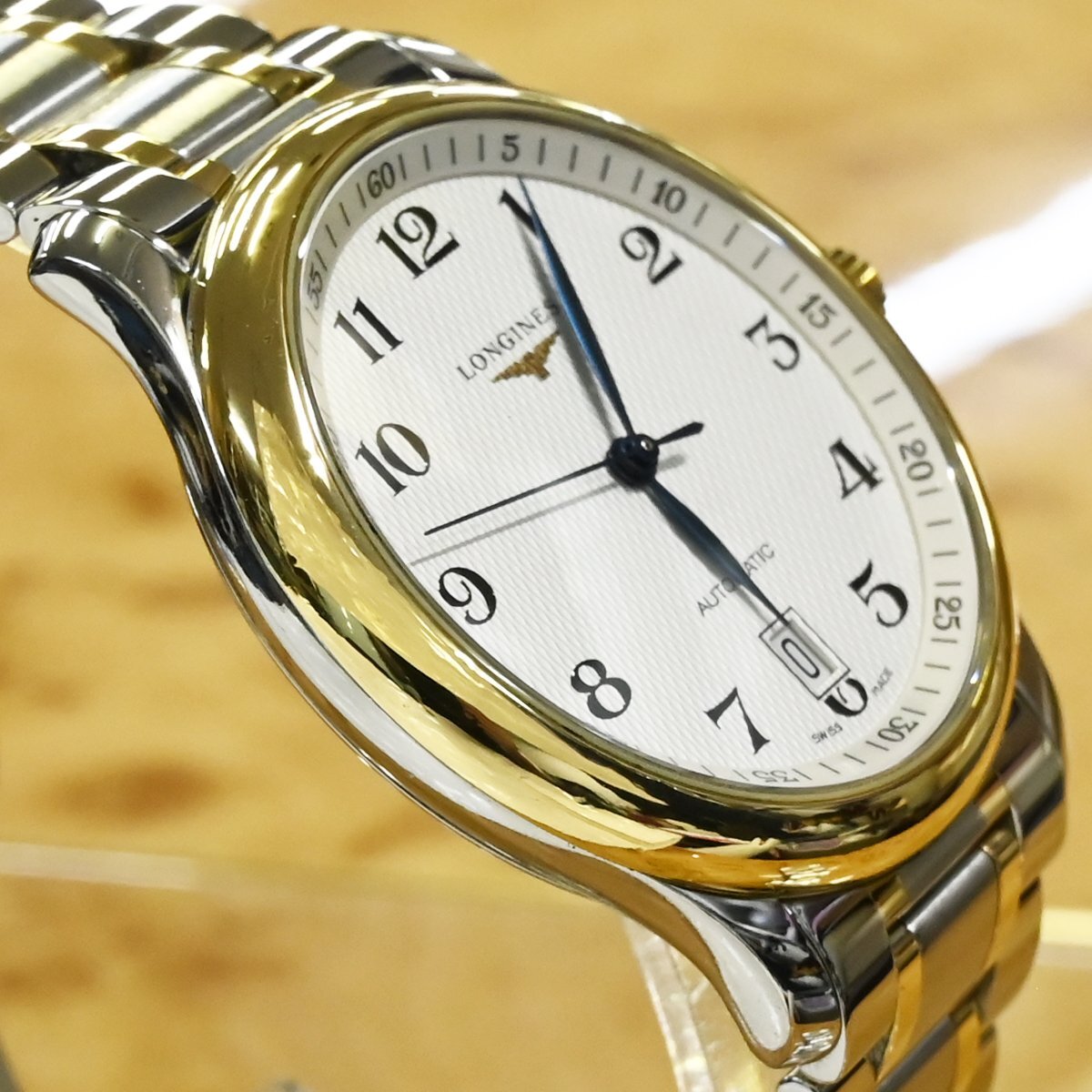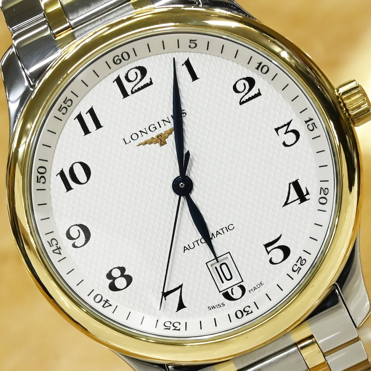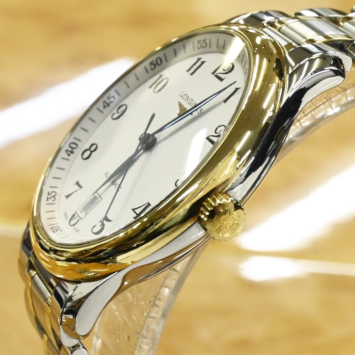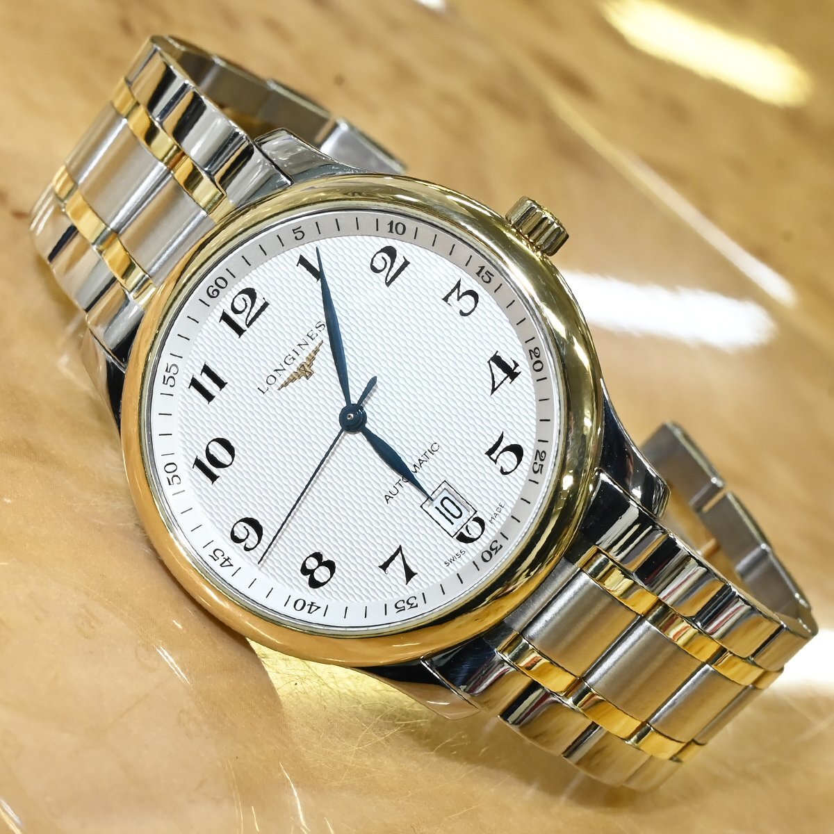 ロンジンのL2.628.5 マスターコレクション 38mmです。 柔らかなゴールドの光沢がホワイトのギョーシェダイヤルと見事に調和し、視認性の高いアラビア数字とブルースチール針がクラシックな印象を引き立てます。 裏蓋はサファイアクリスタルのシースルーバック仕様。 心臓部には、Cal.L619.2(自動巻・42時間パワーリザーブ)を搭載し、スイス製ならではの精緻な動きを堪能できます。 ビジネスにもカジュアルにも映えるタイムレスなデザインと、ロンジンならではの信頼性。 手元から放たれる品格が、日常の一瞬を格別な時間へと変えてくれるでしょう。 市場でも圧倒的な人気を誇るメゾンのお品なのでお探しの方も非常に多いかと思います。 ※基本動作確認済。 |
