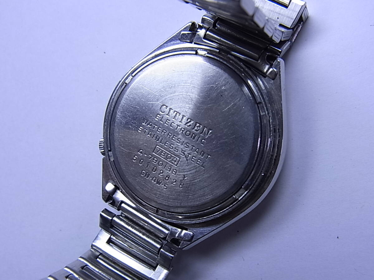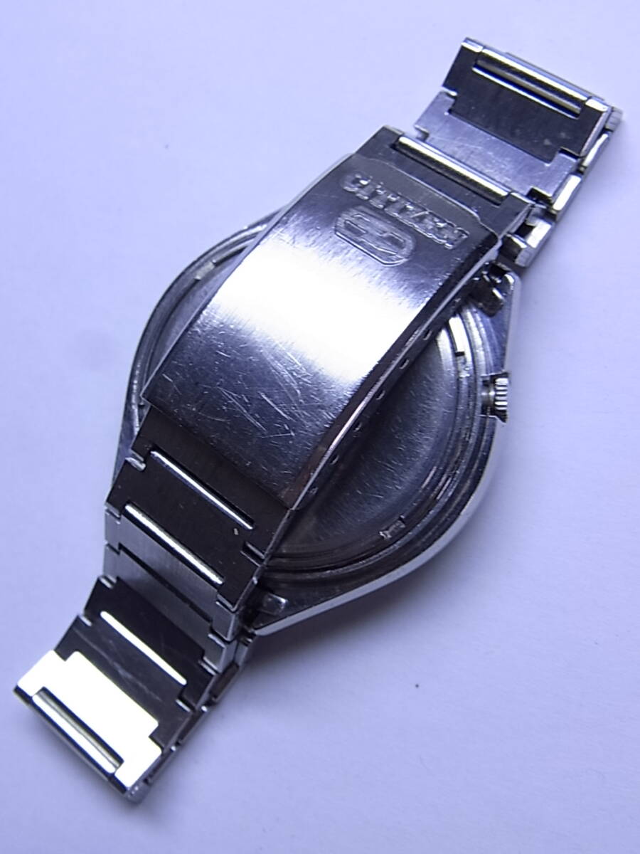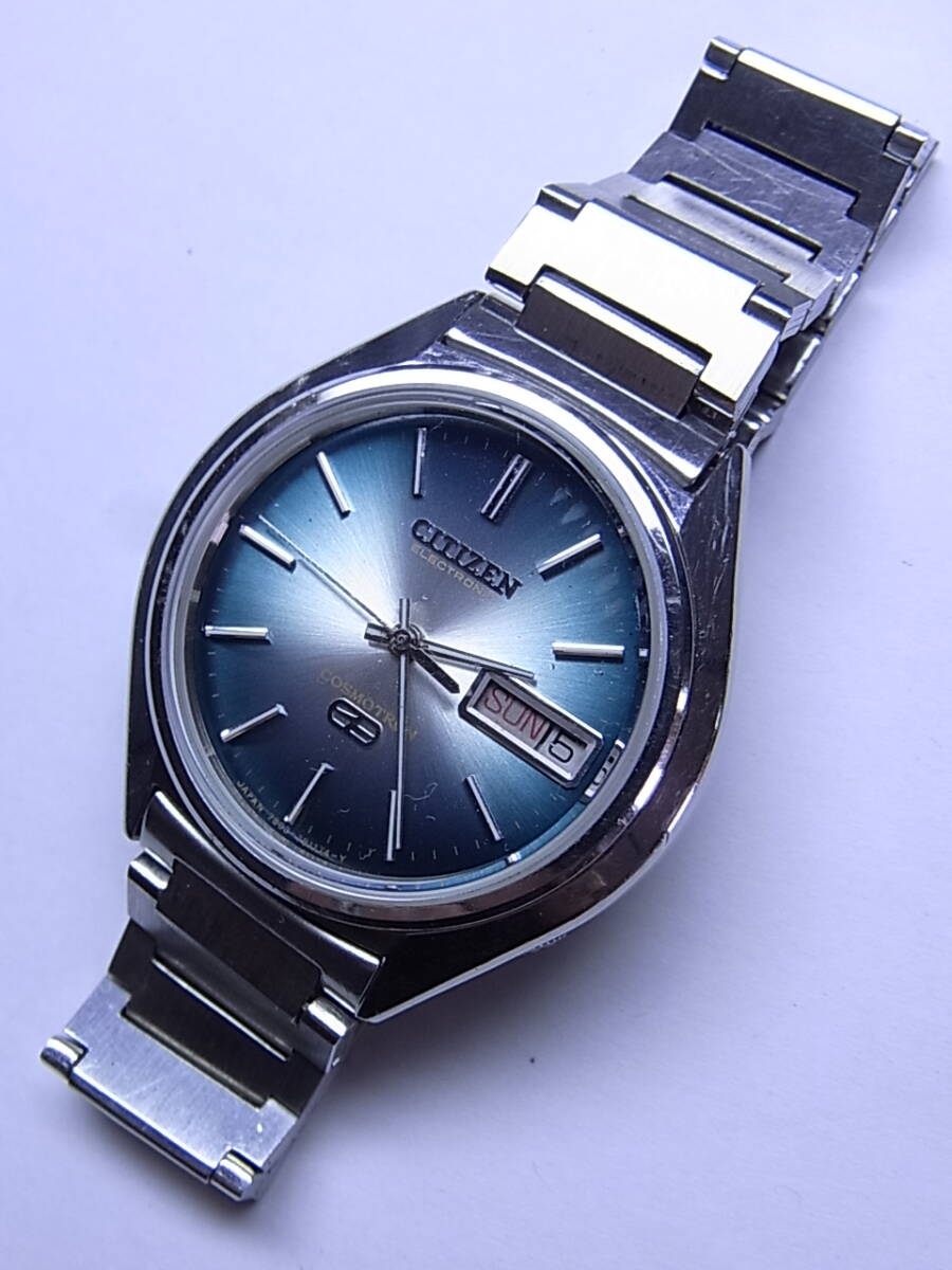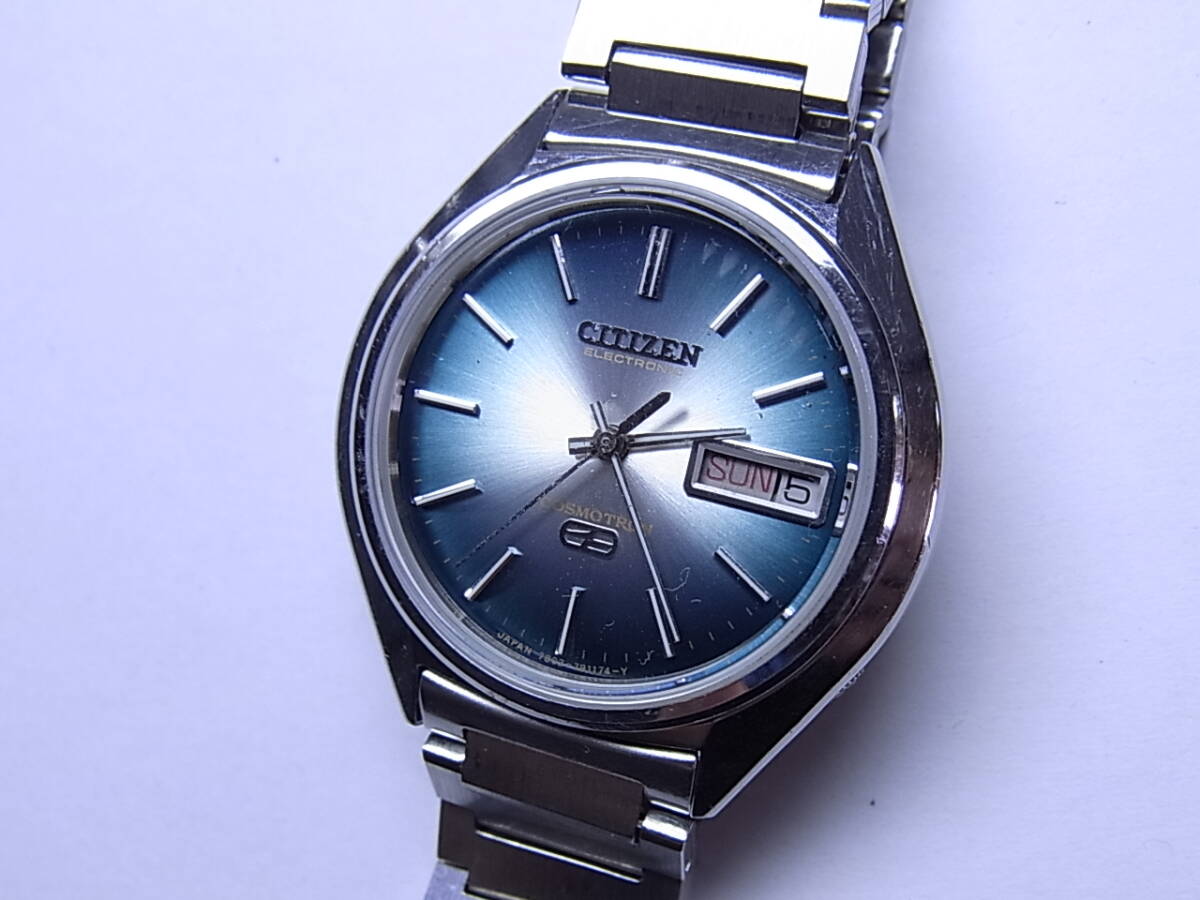 CITIZENシチズンの電磁テンプ式メンズウォッチCOSMOTRONコスモトロンです。文字盤カラーはグリーン系グラデ。電磁テンプとは電池を動力源にして機械式時計のしくみで時計を動かすものです。ガラス面は目視チェックにおいて特に目立つようなキズはありません。ケースやブレスは多少のスレ、スクラッチがありますが、全体的には悪くないコンディションだと思います。簡易クリーニング済。ケース横幅約38mm、腕周り現状約17.8cmでこれ以上大きくすることはできません。現在、電池も入っており快調に動いていますが、電池寿命は不明。中古品ですのでご不明な点はご質問頂き、十分ご納得のうえでご入札ください。安値スタートですので落札後の返品、クレームはご容赦願います。発送はゆうパック、レターパックプラス、ライト。なお、評価に「悪い」が多い方や新規の方の落札者に不払いが多いため、「悪い」評価が全体の3%以上ある方は入札しても削除させて頂きます。また新規の方、評価の少ない方もこちらの判断で削除させて頂くことがあります。