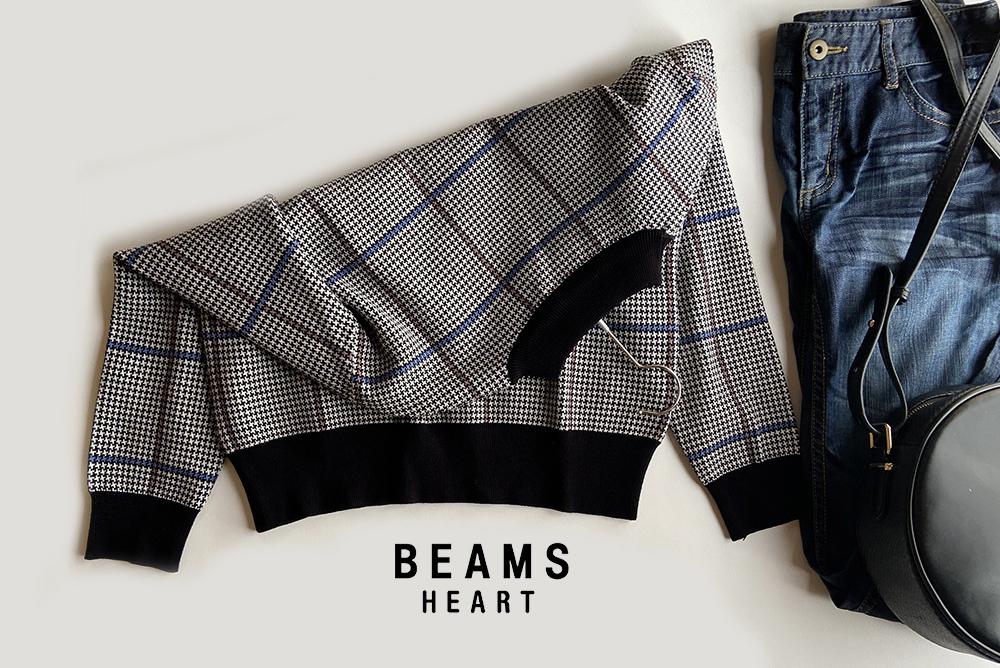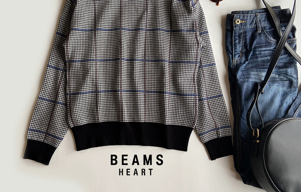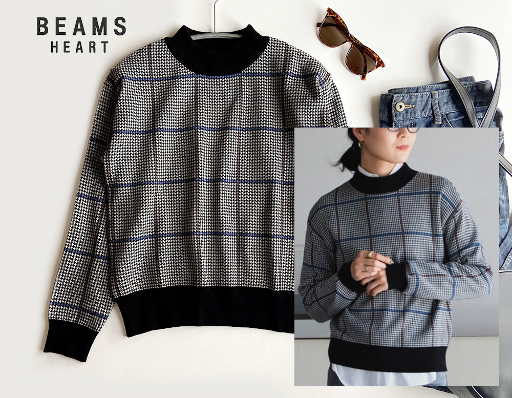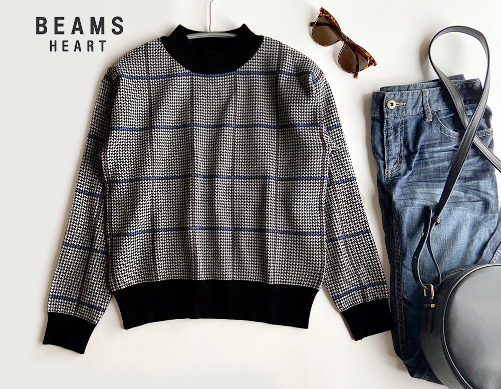 ☆BEAMS HEARTビームスハート☆ 細かい千鳥柄にポイントカラーでラインを入れたチェック柄のジャカードニットプルオーバー。 1枚目の画像でモデルさんが着用しているものと全く同じものになります。 表面がフラットな編地で、ロングシーズン着用できるのもポイントです。 ★素材・・・レーヨン67%、ポリエステル33% ★サイズ・・F 着丈52.5cm、肩幅45cm、身幅48cm、袖丈50cm ★状態・・・目立った傷や汚れなし | ||