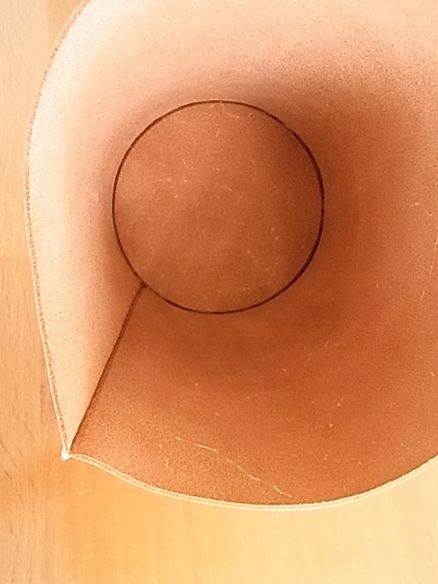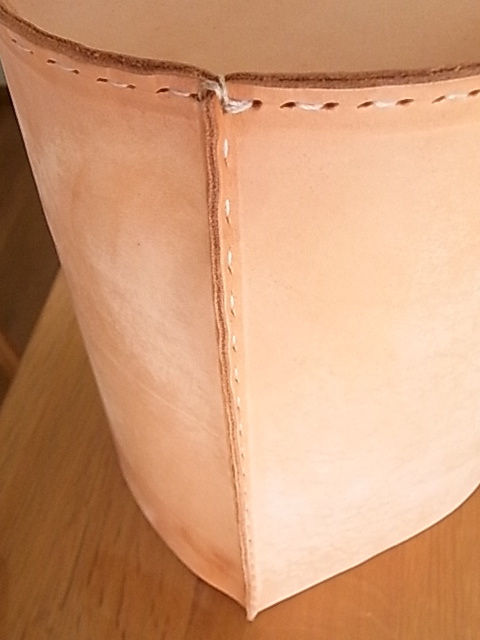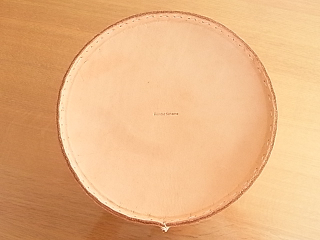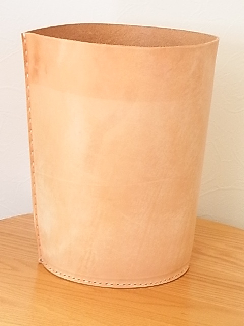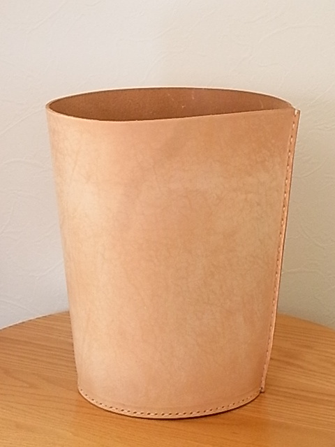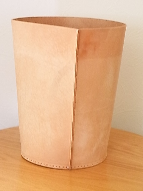 エンダースキーマ ダストボックス (ナチュラル)です。素材は3mmの革製で、使用していませんが、ずっとしまっており、ナチュラルのため色の変色が見られます。サイズは、サイズは、縦30cm, 底部分直径20cm、上部直径24cm程です。