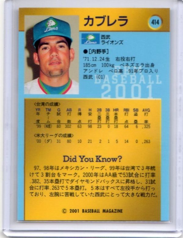 カブレラ NPB初年度カード ------------------------------------------------------------- ■アレックス・カブレラ: メジャー1年(2000年デビュー/内・外野手) 31試合 21安打 5本塁打 14打点 0盗塁 打率.263 2001-12年 西武/オリックス/ソフトバンク在籍 カブレラ・ファンの方、是非どうぞ! |