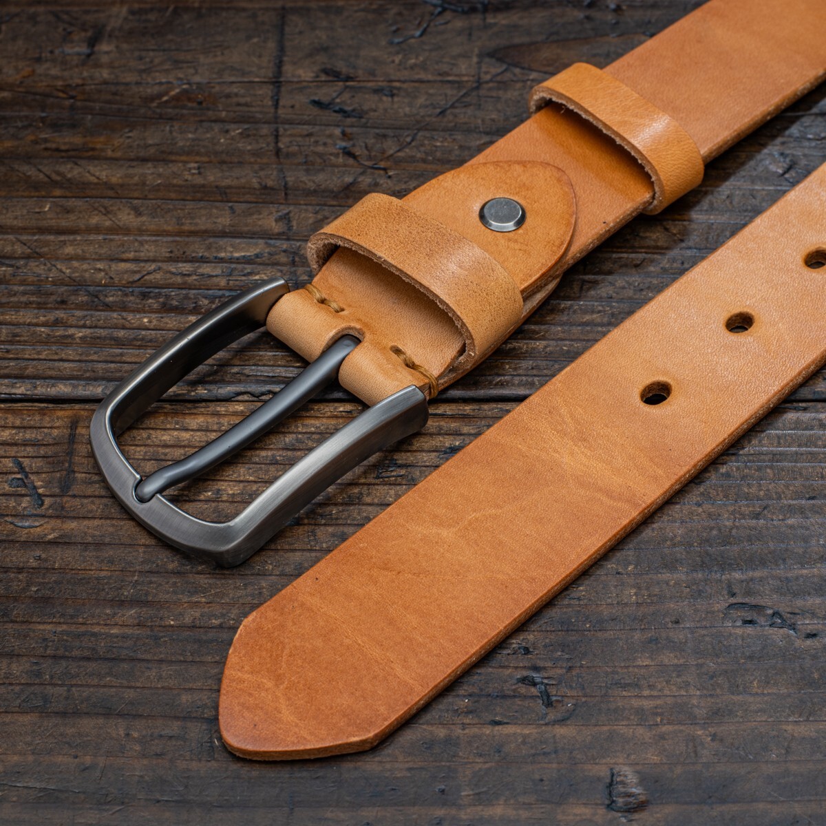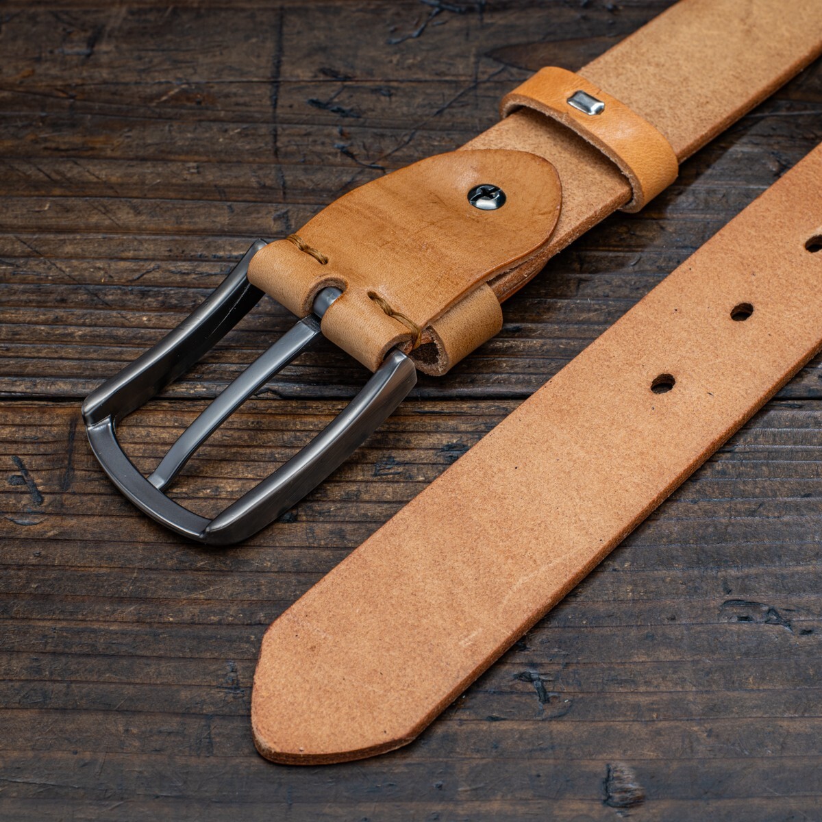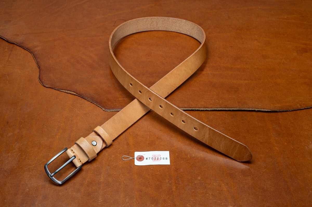 ナチュラルタンに仕上げたイタリアンレザーのベルトです。ベジタブルタンニンで鞣したヌメ革を一枚革で使い、革本来の質感や表情をそのまま楽しめます。表面には天然のシワや血管の跡がうっすらと現れることもあり、一本ごとに異なる風合いが出ています。