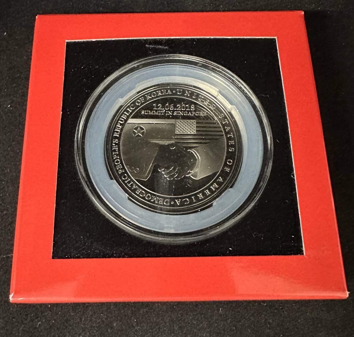 • 表面(オモテ): トランプ大統領と金正恩委員長による握手が力強く描かれ、両国の国旗(アメリカ・DPRK)がデザインされています。