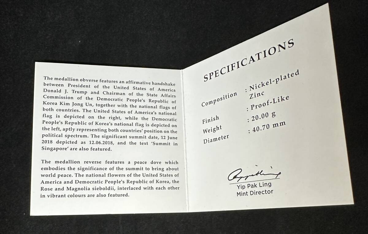 この度は、ご覧いただきありがとうございます。 2018年6月12日にシンガポールで行われた、史上初となる米朝首脳会談という歴史的な瞬間を記念して、シンガポール造幣局から発行された大変貴重な公式メダリオンです。