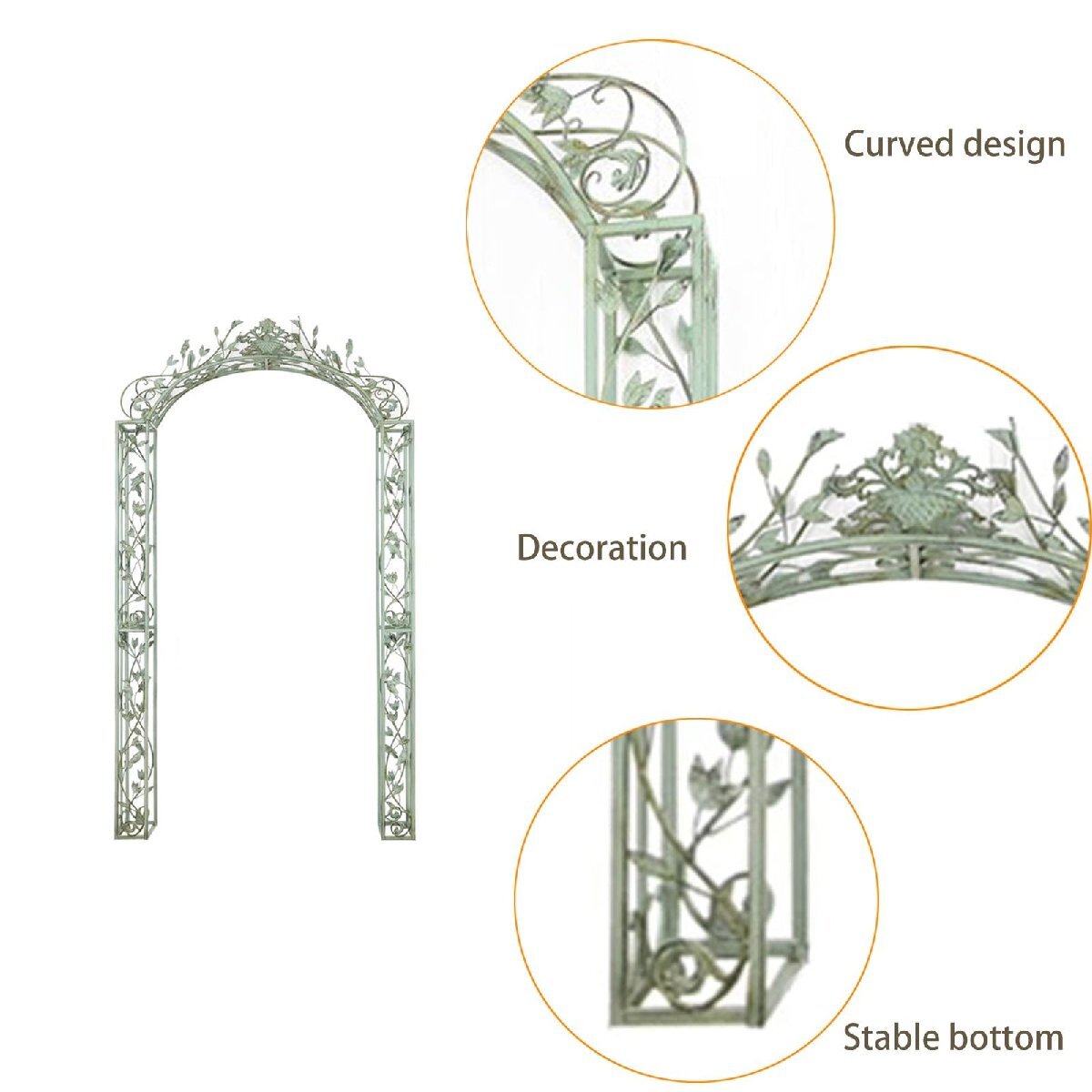 ? 金属構造と磨耗や風化を防ぐ塗装面で長持ちするように作られたアーチ道は、錆びにくく、ぐらついたりひび割れたりしにくく、屋外での長期間の使用に最適で、メンテナンスの必要がありません。? ガーデントレリスは、つる植物やバラの成長を助け、美しく鮮やかなつる植物や花があなたの庭を飾るために繁栄したシナリオを提示します。また、バルーン、チュール、ライトでさまざまなスタイルに飾ります。? 絶妙な職人技を備えた金属アーバーは、滑らかなラインとエレガントな外観を備えており、庭や裏庭の入り口の焦点になります。あなたの想像力と創造性をサポートして、すべての行動を導きます。? このアーバーアーチは、結婚式、誕生日の婚約や記念日のパーティーやイベント、恋人のテーブル、写真の背景、パーティーの装飾に適しており、印象に残り、永続的な思い出を残します。? パーゴラアーバーは屋内でも屋外でも簡単に組み立て、分解できます。セットアップや分解、保管も数分で簡単に行え、必要に応じて庭の適切な場所に取り外すことができます。