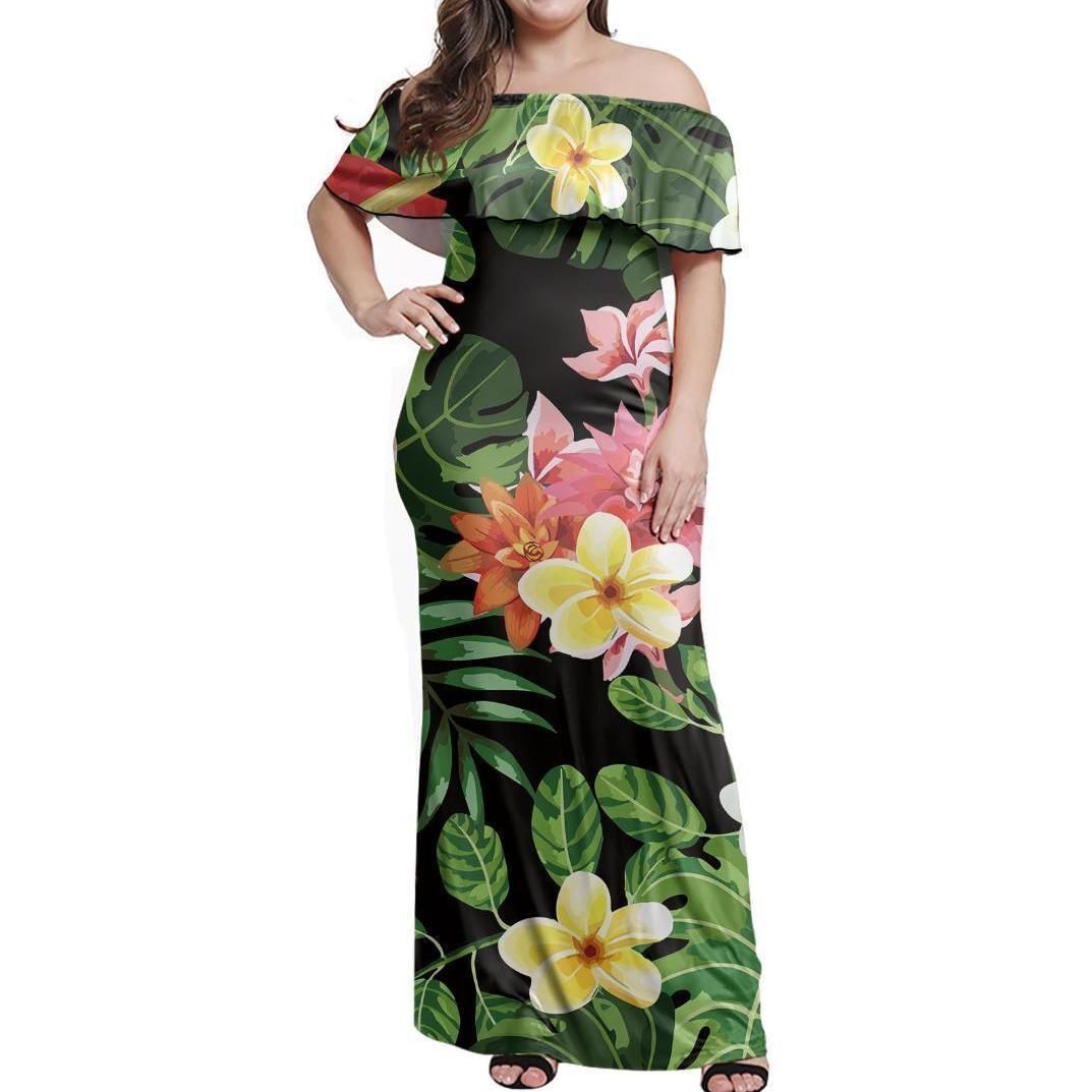ハワイアンドレス ポリネシアプリント オフショルダードレス セクシー パーティー ロングドレス マザー 旅行 ビーチ 海外 フラダンス 衣装 発表会 ストレッチ素材 黒 花柄 903