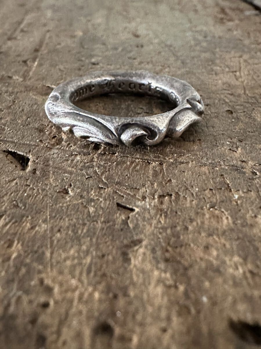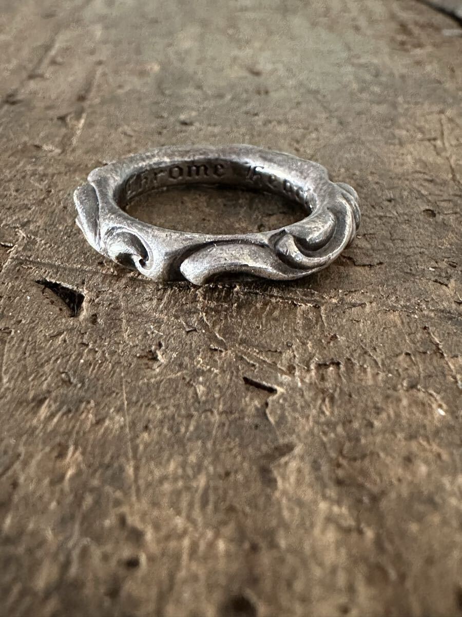 リング全体に「CHROME HEARTS」の文字がスクロール状に刻まれています。