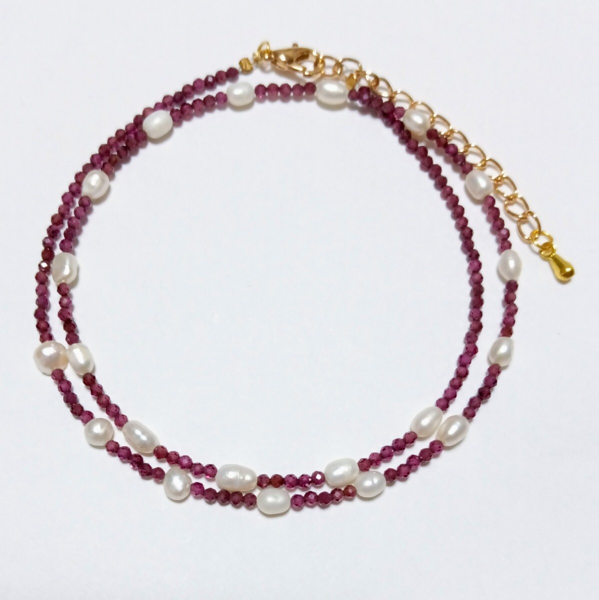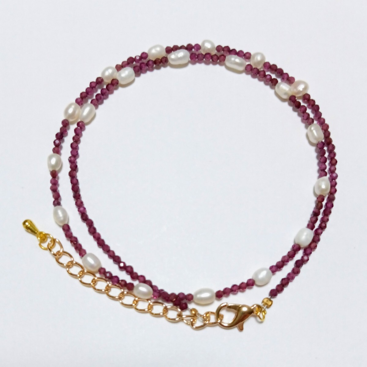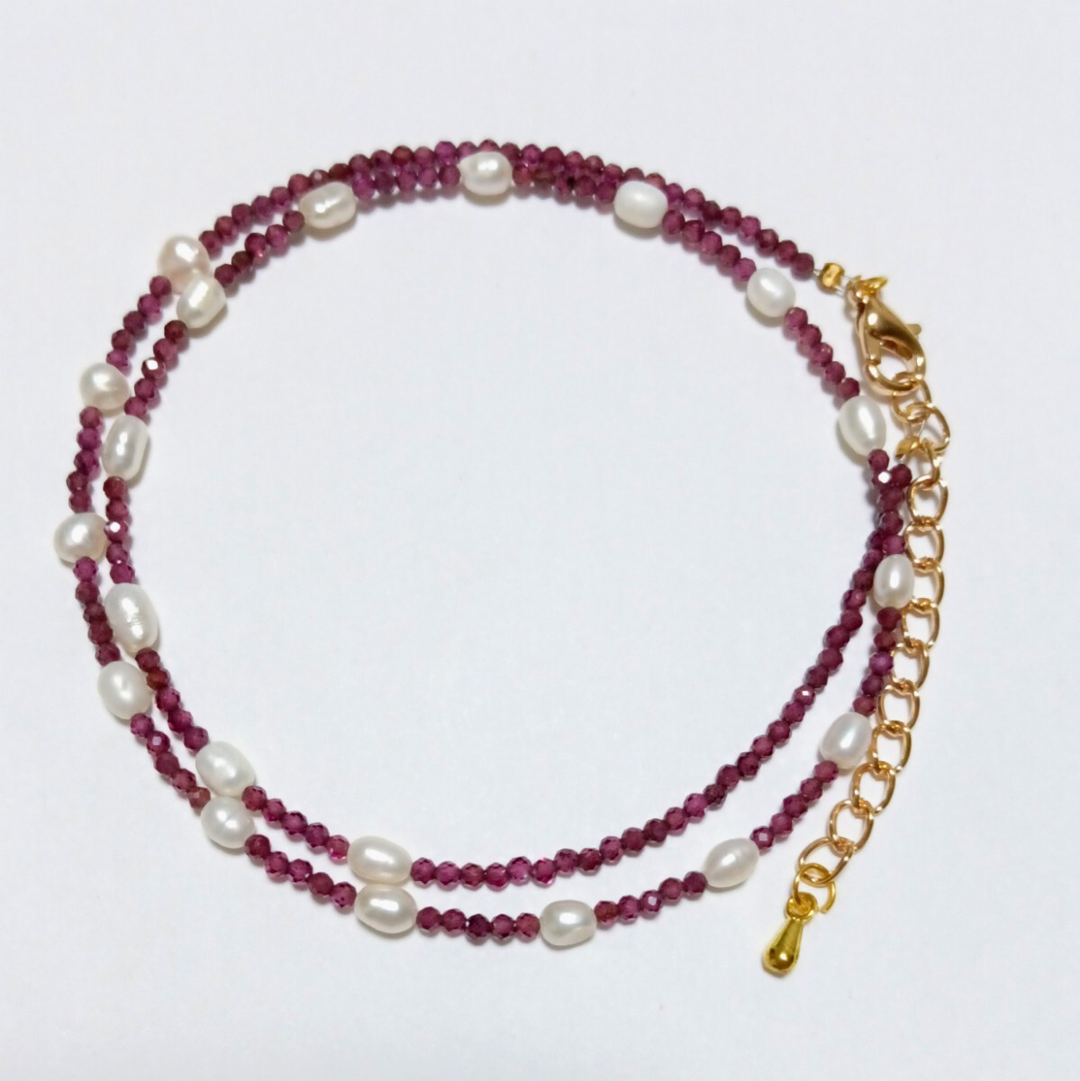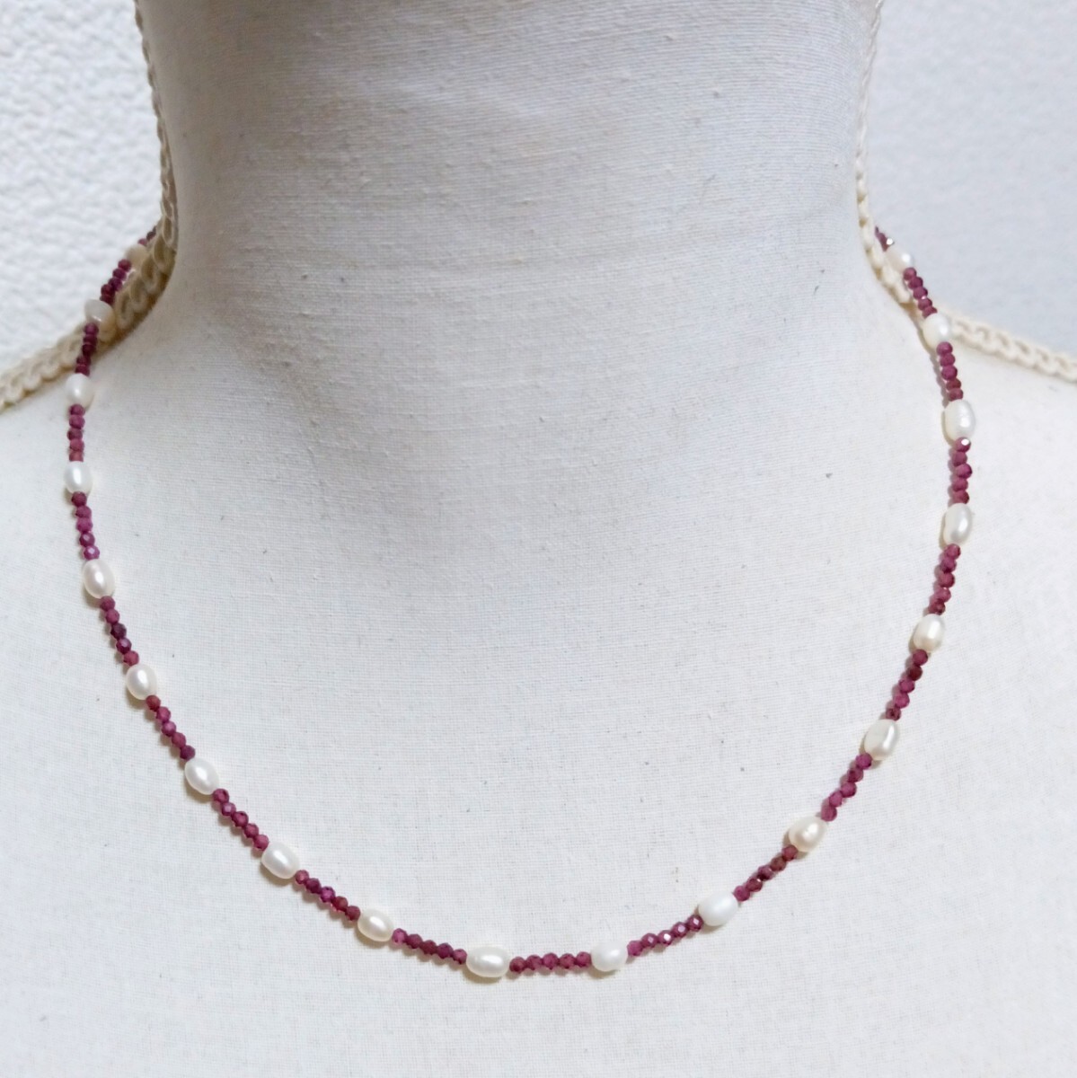 きれいな濃赤色、ミラーカットの天然ロードライトガーネットと小粒淡水パールのネックレスです。
