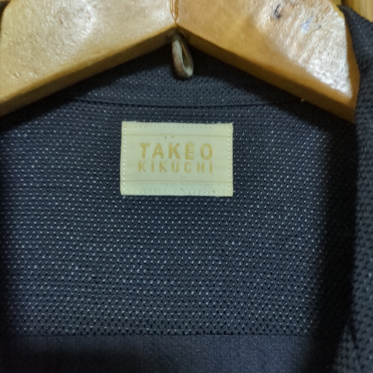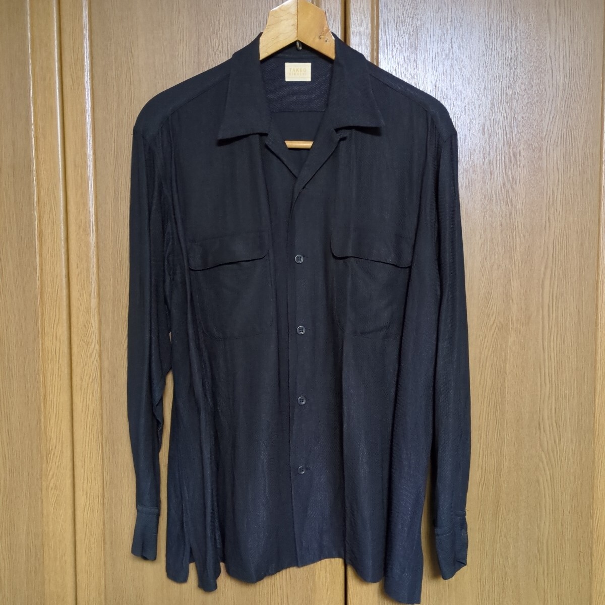 日本製、タケオキクチの黒い開襟シャツです。レーヨンのテロッとしたいい生地です。開襟、ボックス型シルエットで、50sなクラッシックな雰囲気です。若干の使用感ございますが、特に大きなダメージも無く、まだまだ着用して頂けるかと思います。あくまでもUSED品ですので、神経質な方、古着のご理解の無い方、入札お断りです。サイズは、平置き採寸で、肩幅48センチ、袖丈56センチ、着丈71,5センチ、脇下身幅46センチです。素人採寸ですので、多少の誤差はお許し下さい。