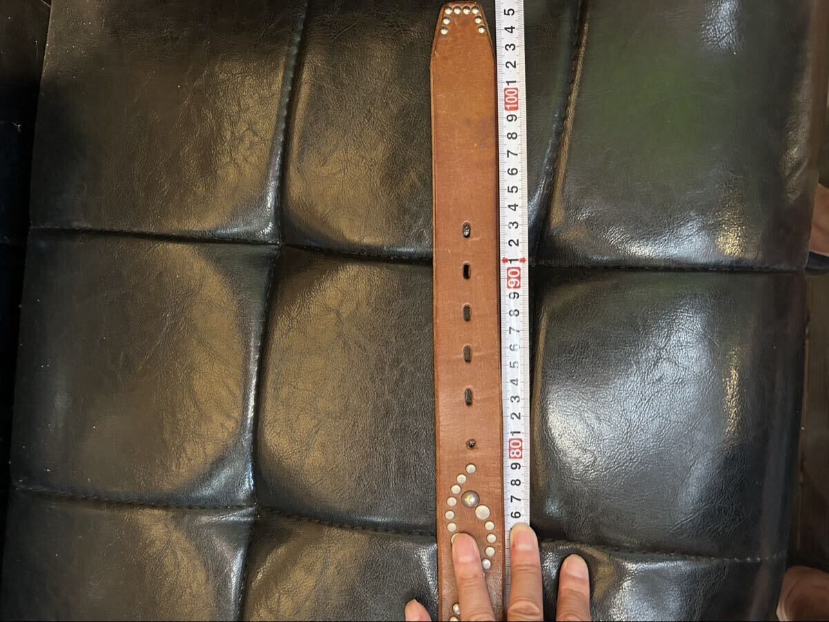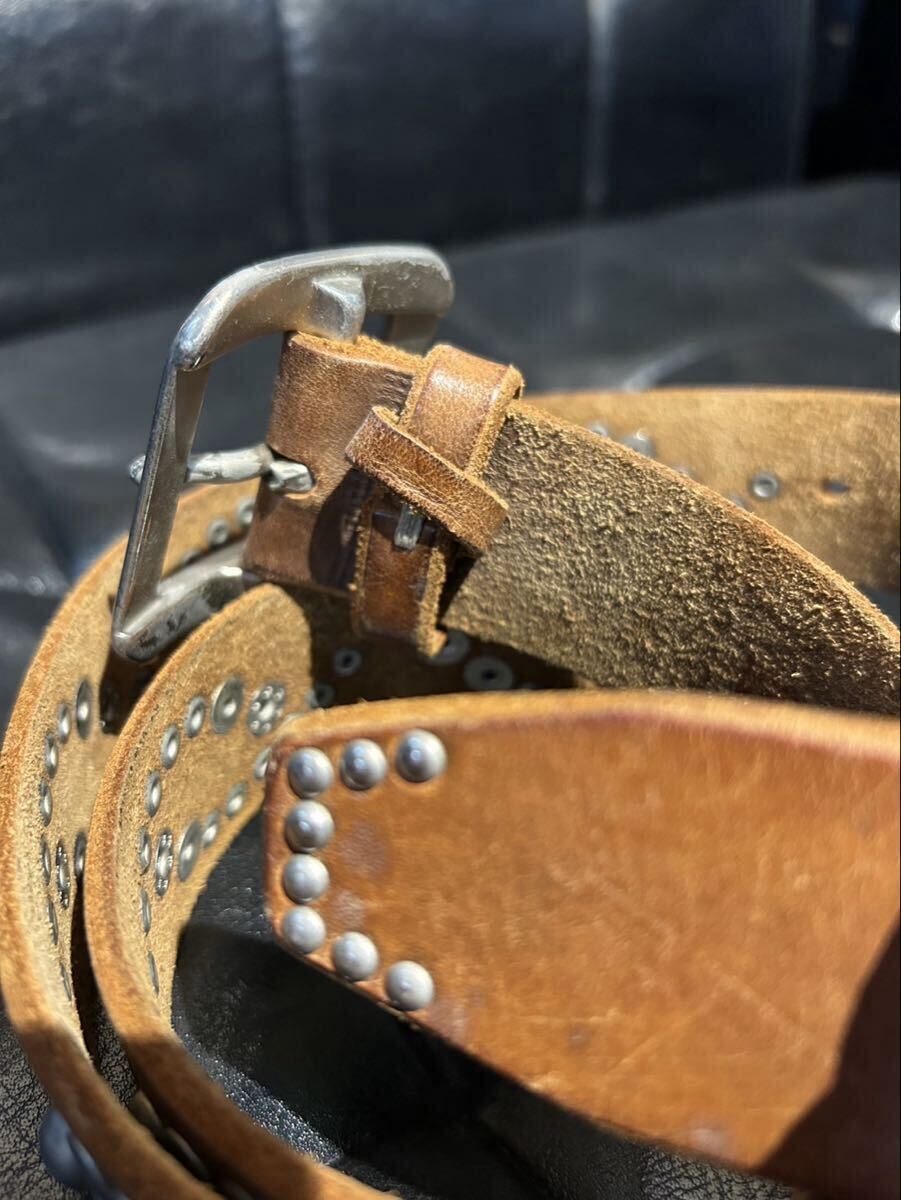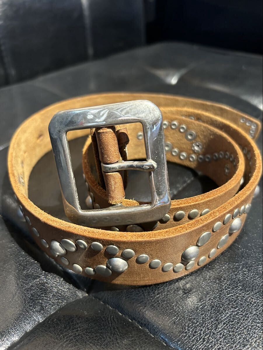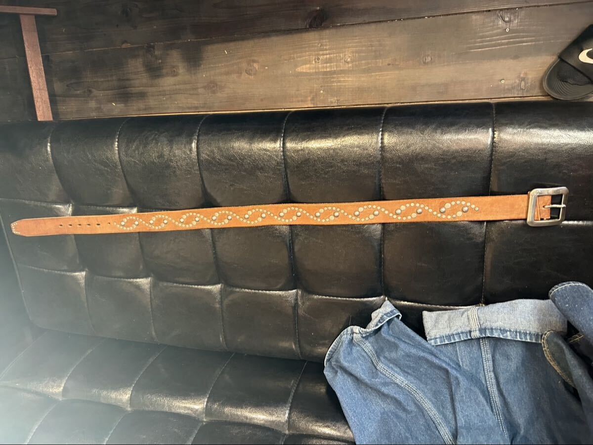 幅約4cm、厚さ約0.5cmの肉厚でしっかりとしたレザーは、使えば使うほど体に馴染んでいき経年変化も楽しめます。ゴツいラウンドスタッズが打たれていて存在感抜群。