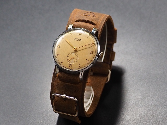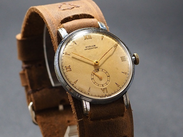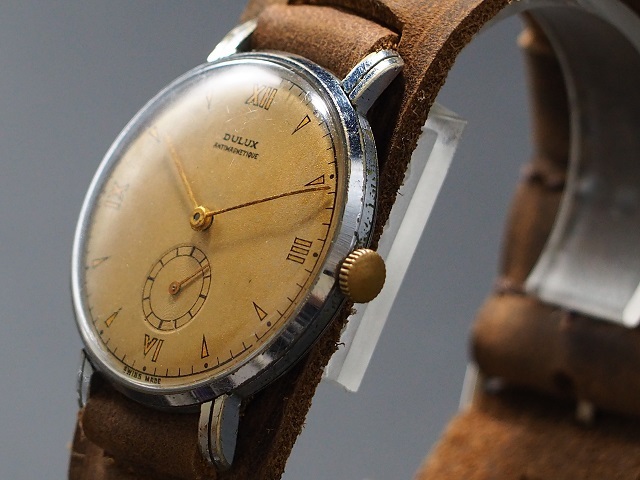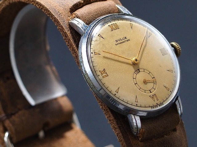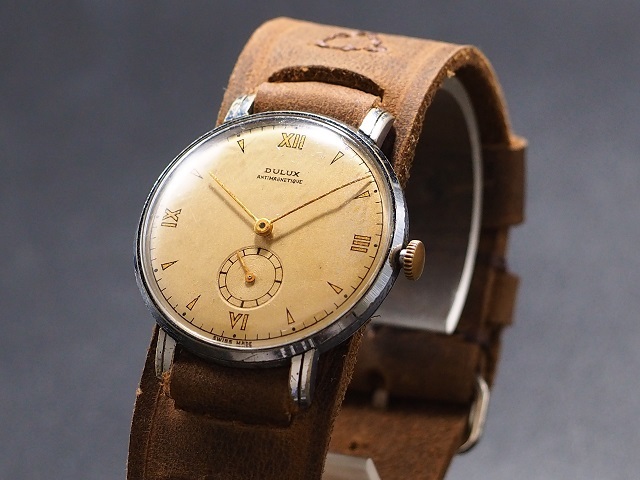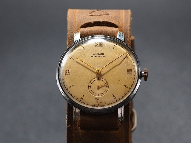 エイジングダイヤル 希少 DULUX 15石 手巻き アンチマグネチック ビンテージ 大型ケース スモセコ スイス製 新品ベルト 稼働点検済み |