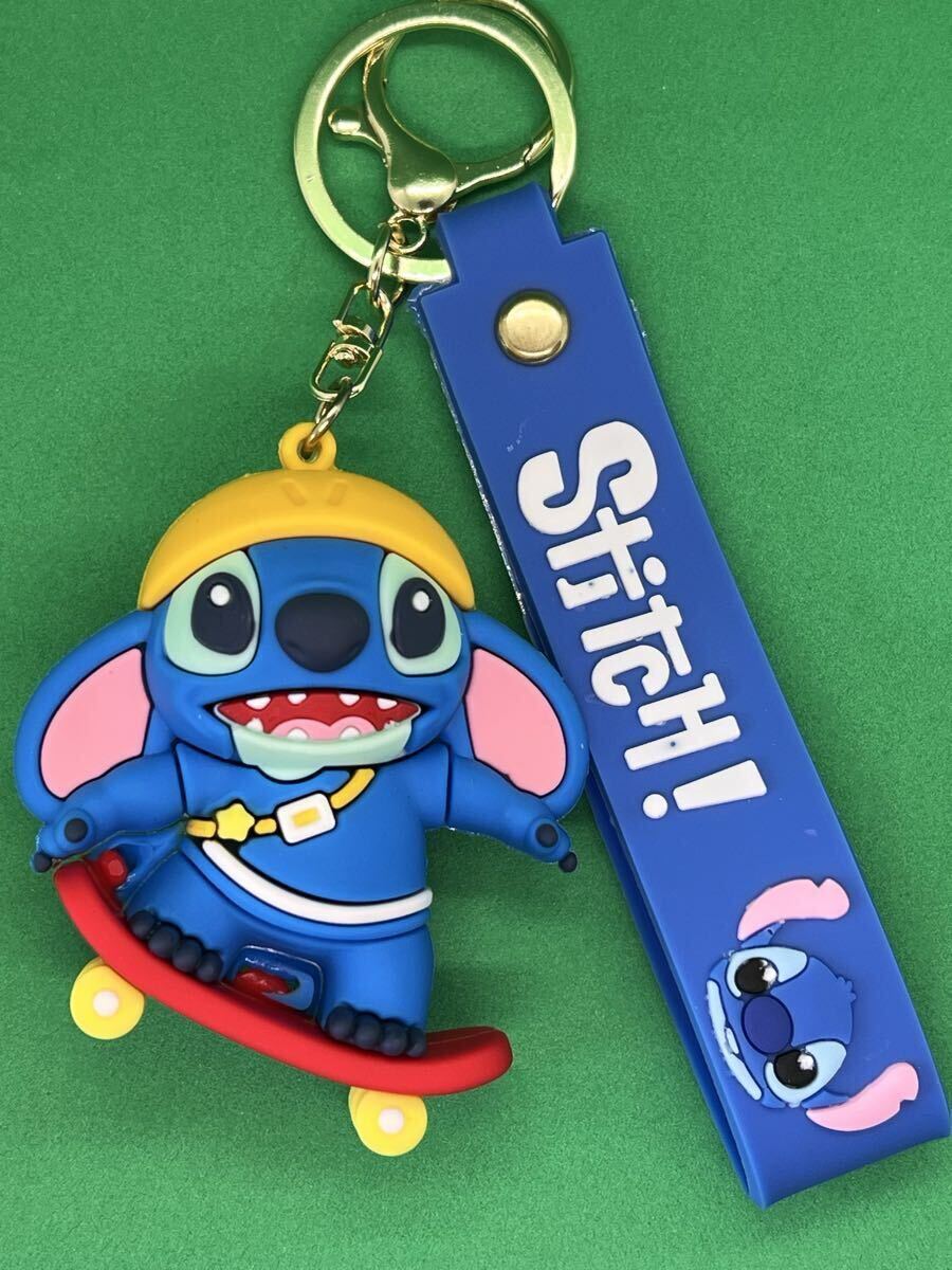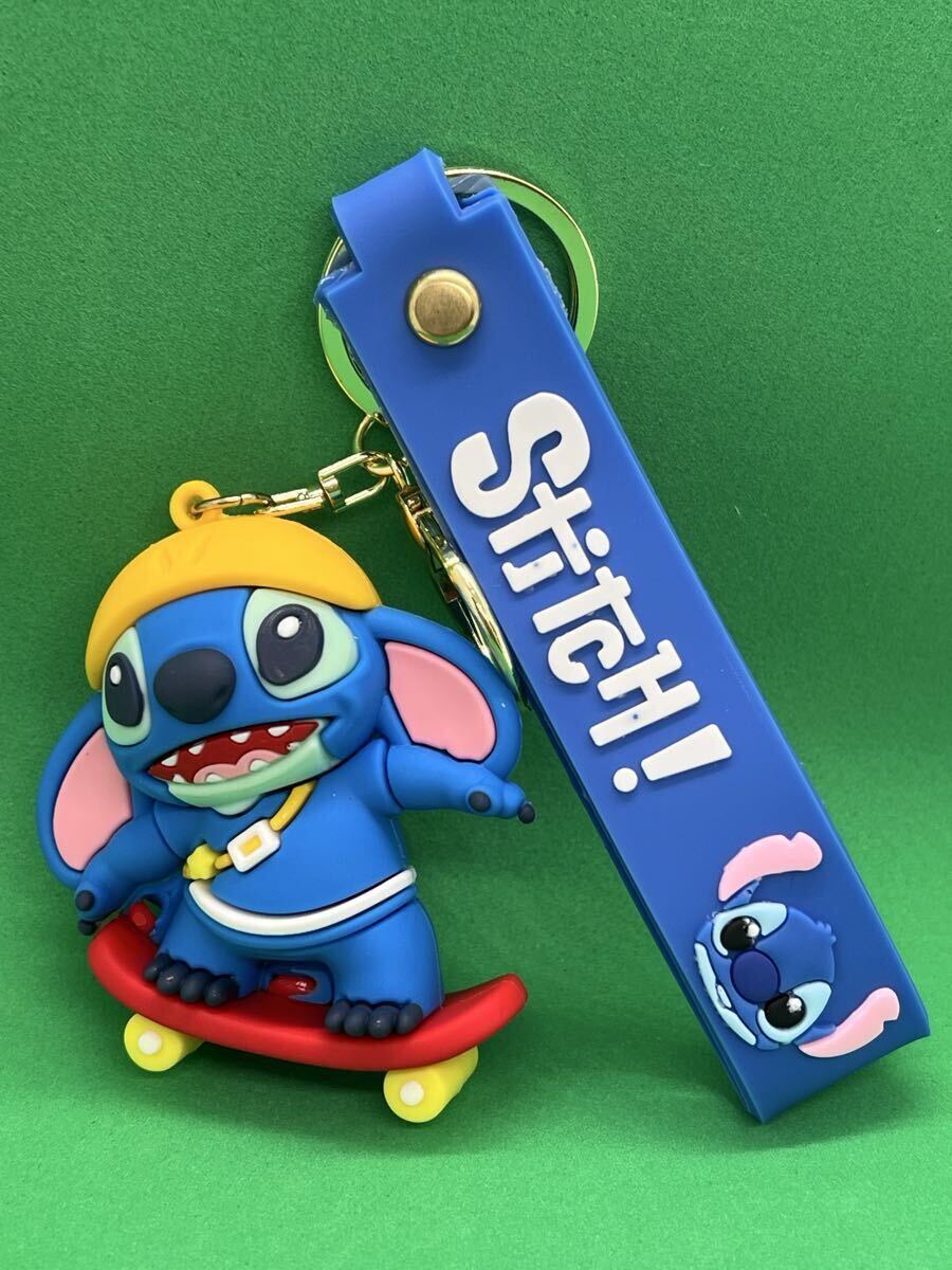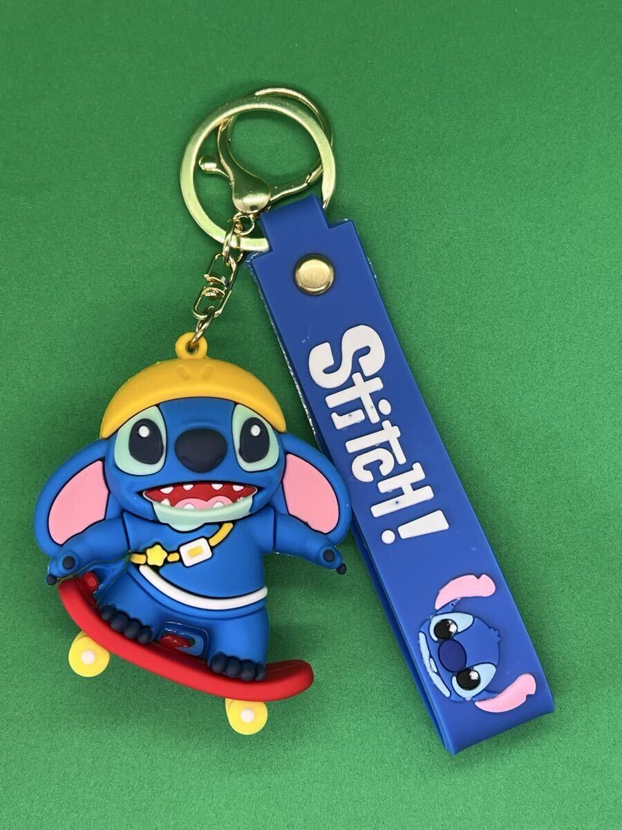 スケートボードを持つスティッチのシリコンキーホルダー。