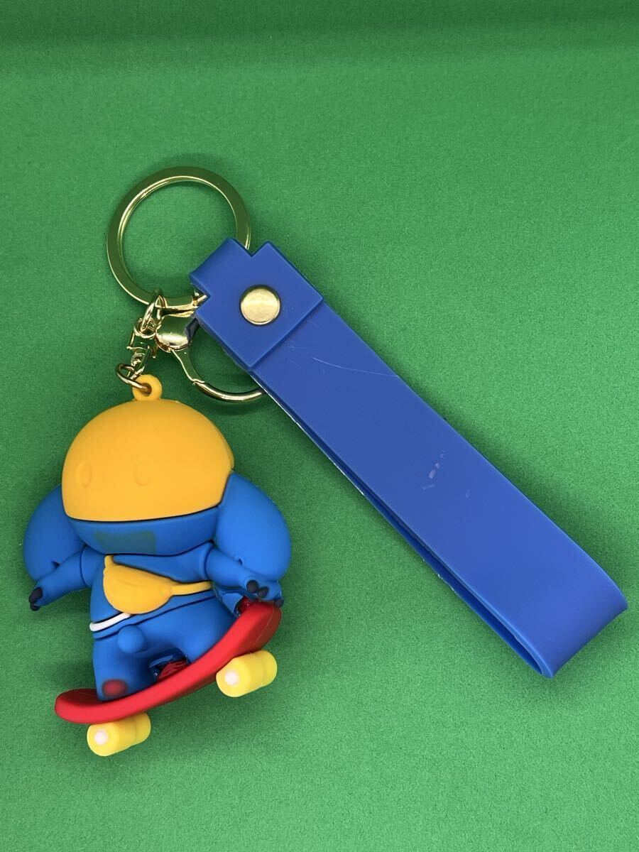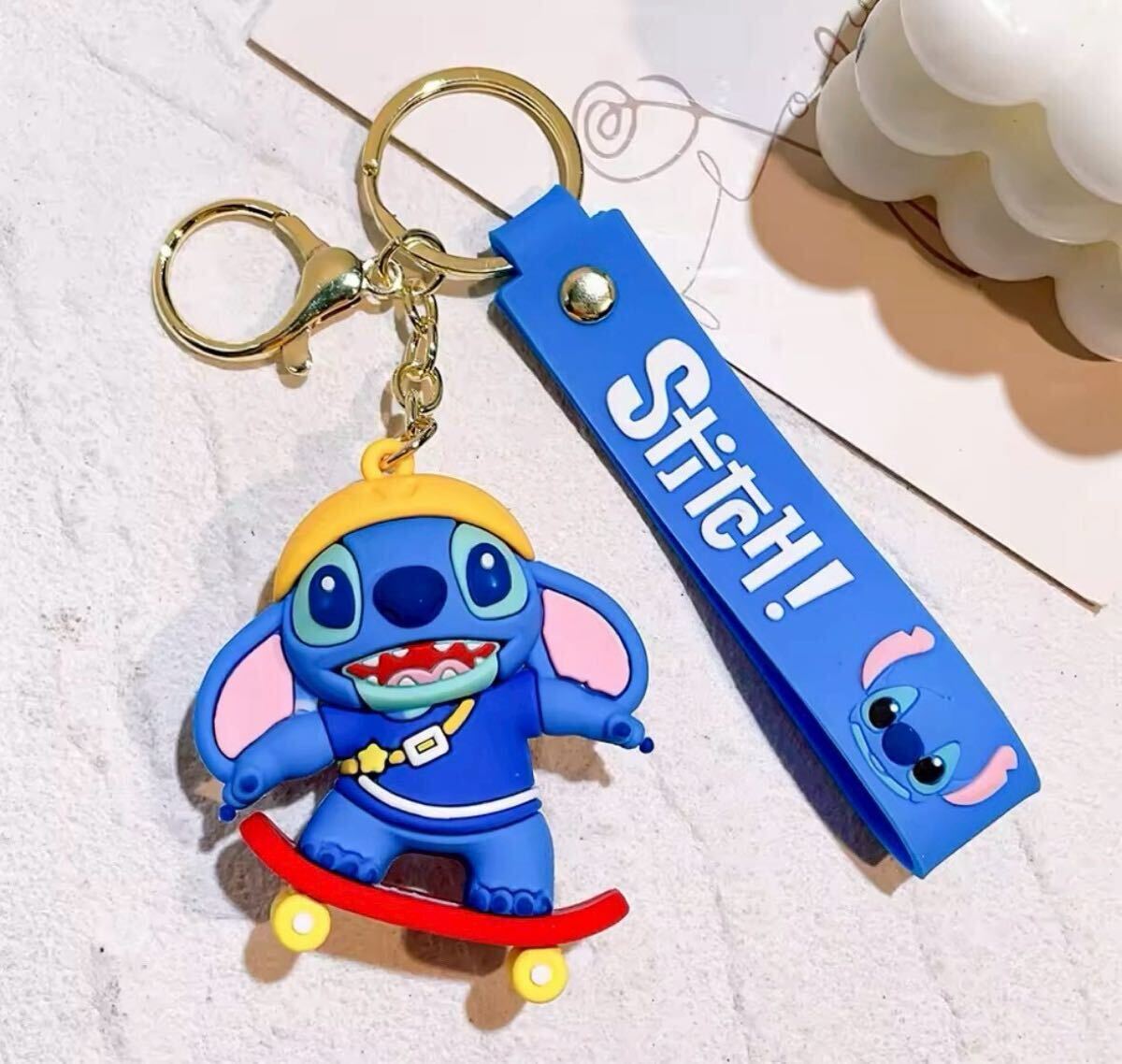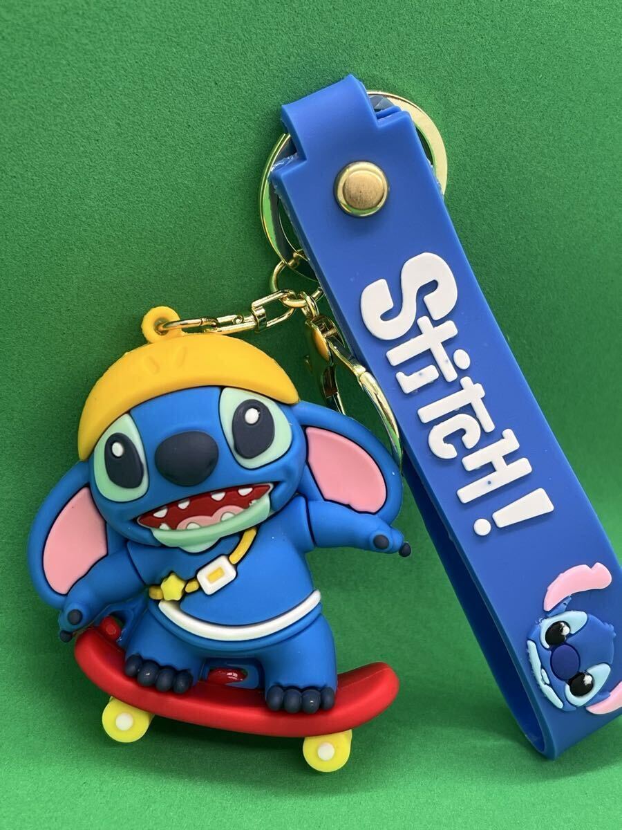 スケートボードを持つスティッチのシリコンキーホルダー。