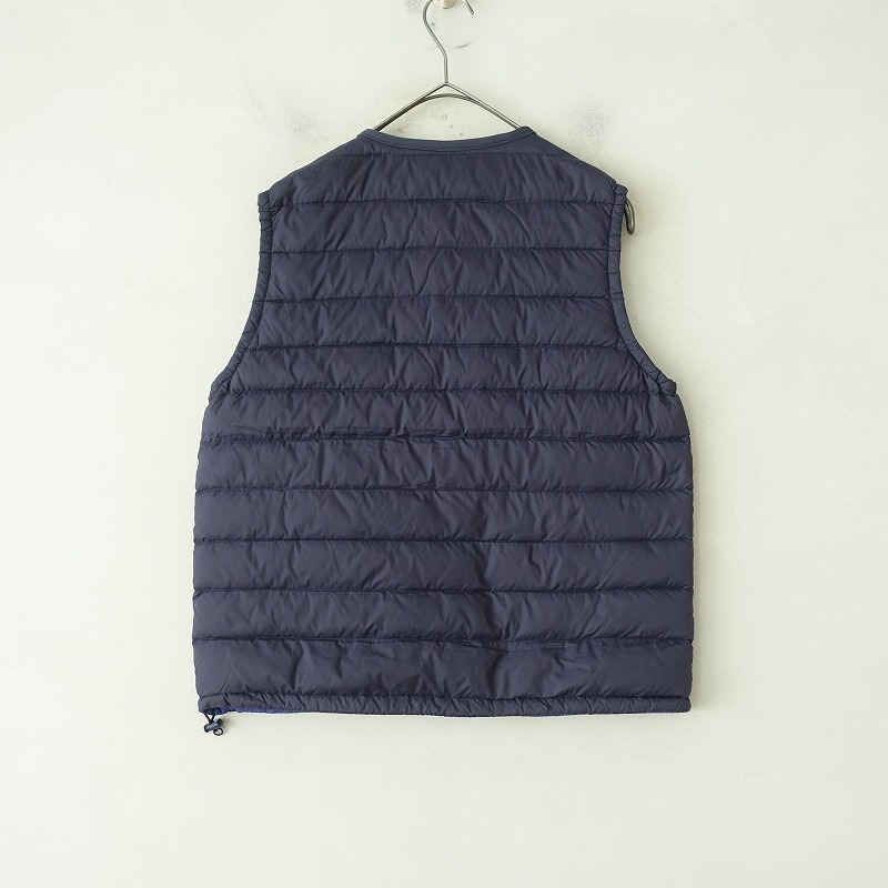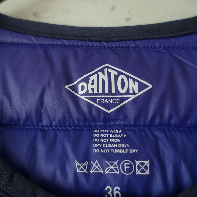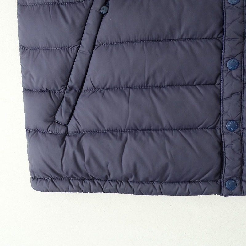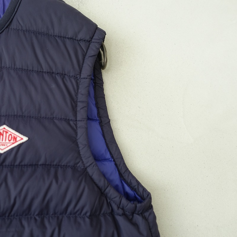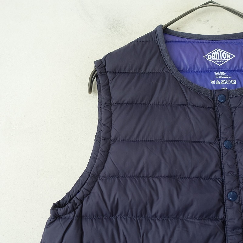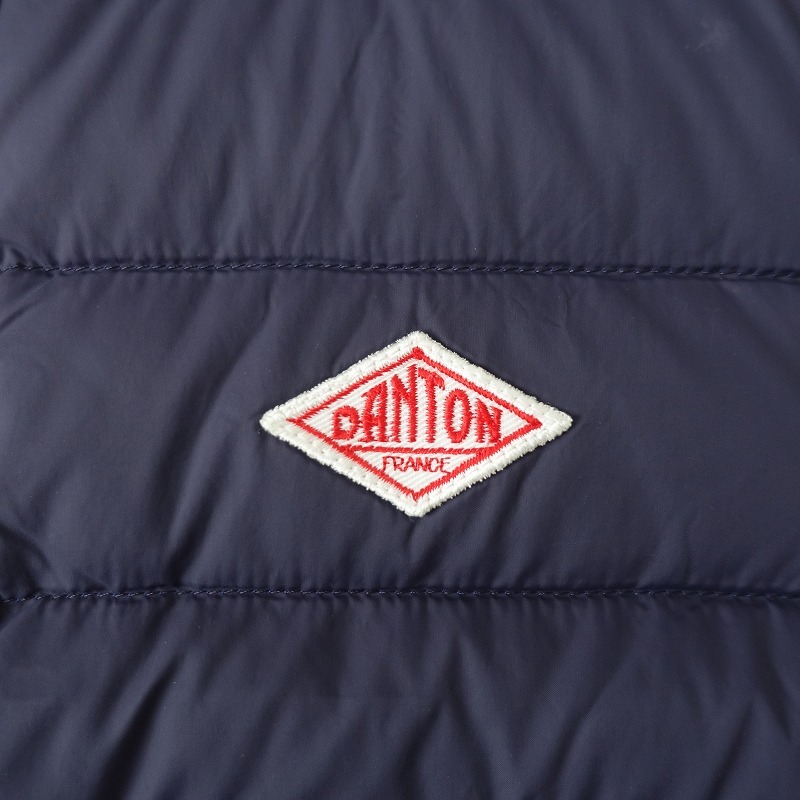 DANTONのインナーダウンベストです。カラーはネイビーで、ダウンフェザーの中綿入り素材で仕立てられ、ブルーの裏地付きです。スナップボタン開閉で、両サイドにジッパーポケット付きです。定価(メーカー希望小売価格) 16,280円の商品です。 |