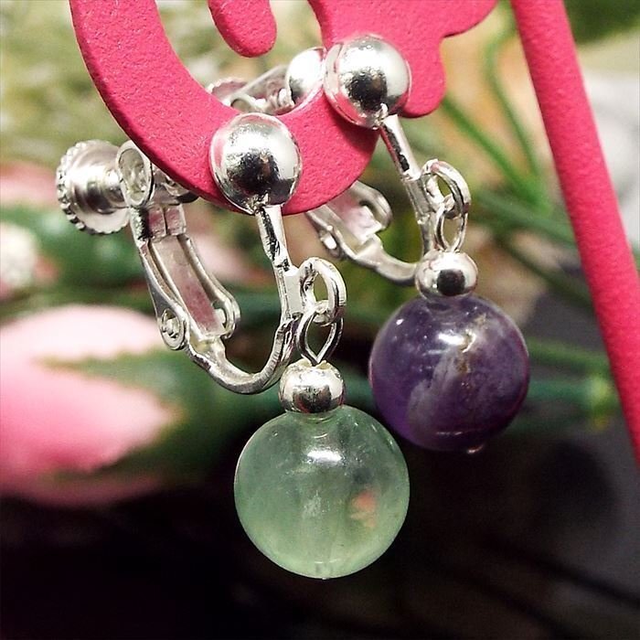【STONE KITCHEN 天然石 パワーストーン】 ☆横顔美人になれる大人可愛い天然石イヤリング☆ シンプルなデザインが石を引き立て 揺れるストーンが可憐さをアピールします♪ フローライトは非常にカラーバリエーションが豊富な石です。 グリーンやパープルを中心に自由に広がる色彩の グラデーションを持つフローライトは他の石には無い魅力を持っています。 和名の蛍石と言う名前はフローライトの破片を 真っ暗い場所で火にくべるとパチパチと音を立て 蛍のように発光する事に由来するものです。 【サイズ】全長:約25mm 【素材】真鍮/フローライト 【内訳】1ペア 玉サイズ:約8mm 注意事項 ※表示のサイズは必ずしも最大値・最小値のサイズのものが入っているわけではございません。 ※天然石のため同じものでも色味・模様などが異なります。 ※照明の具合で実際とは色合いが異なる場合がございます。 天然素材特有のクラック・内包物を有する場合がございます。予めご了承下さい。 | |