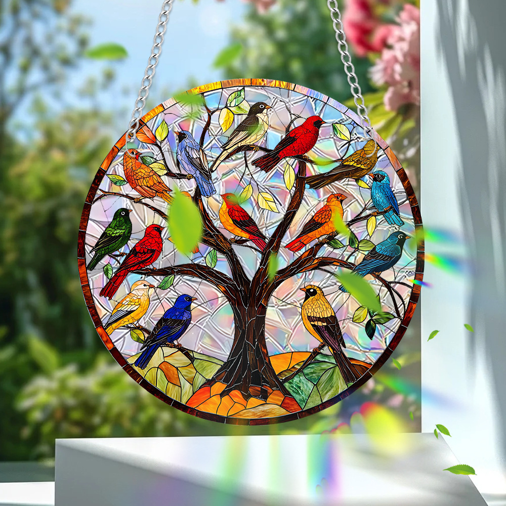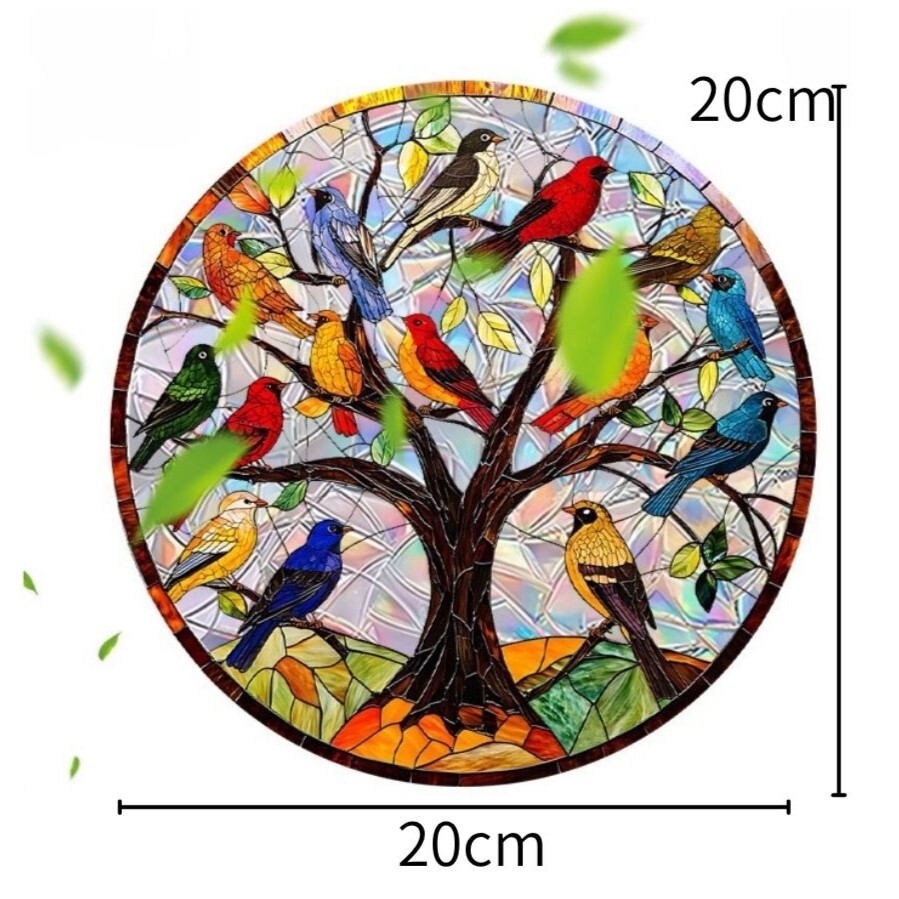 【15羽の鳥と木・カラフル】アクリルプレート 飾り サンキャッチャー チェーン付き オブジェ お洒落 壁や窓辺の飾りに◎