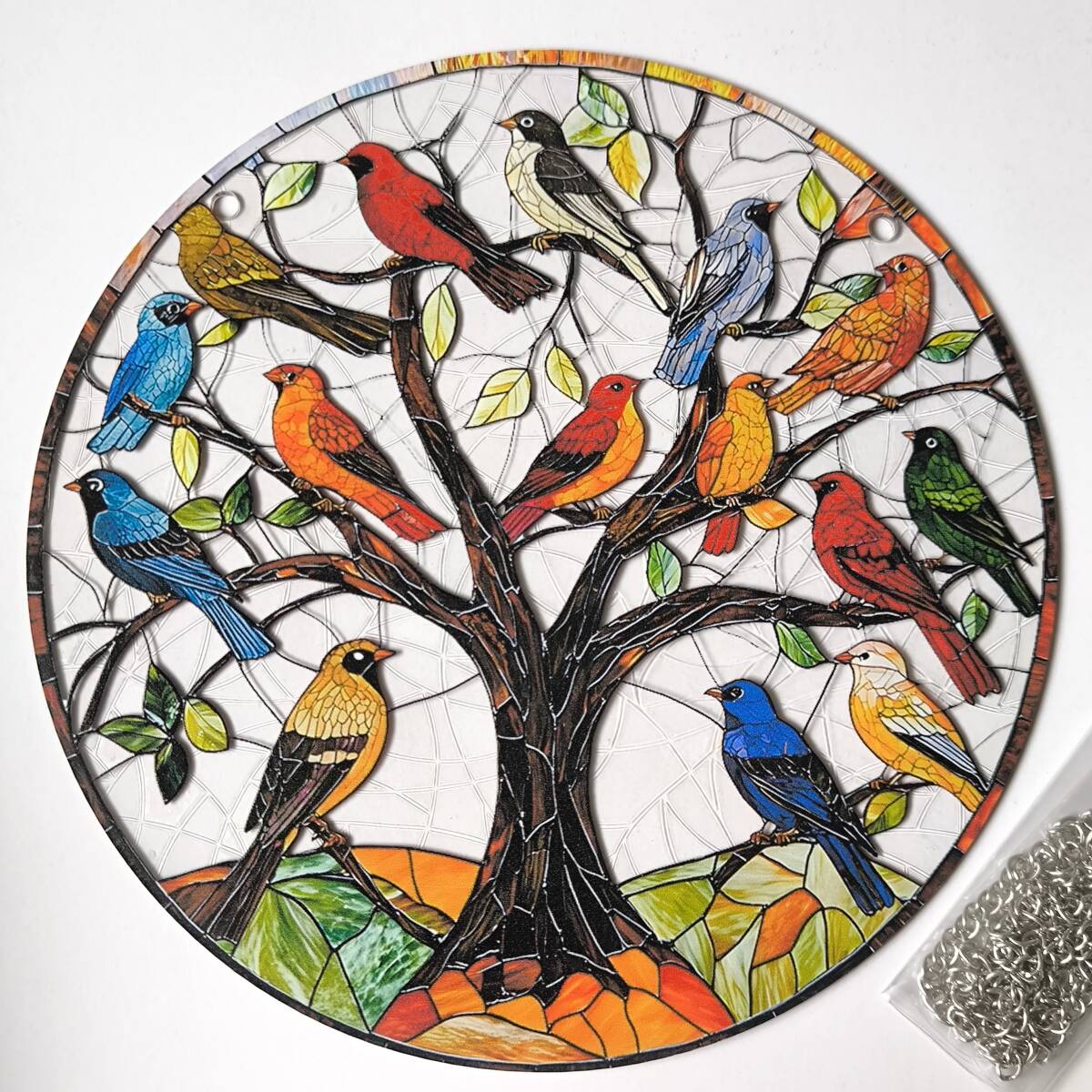 【15羽の鳥と木・カラフル】アクリルプレート 飾り サンキャッチャー チェーン付き オブジェ お洒落 壁や窓辺の飾りに◎◎