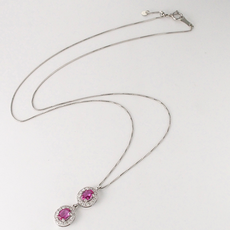 熱処理されていない上品な色味のピンクサファイアとダイヤの輝きが美しいネックレスです。チェーンはスライドアジャスター付きでお好みの長さに調節可能です。