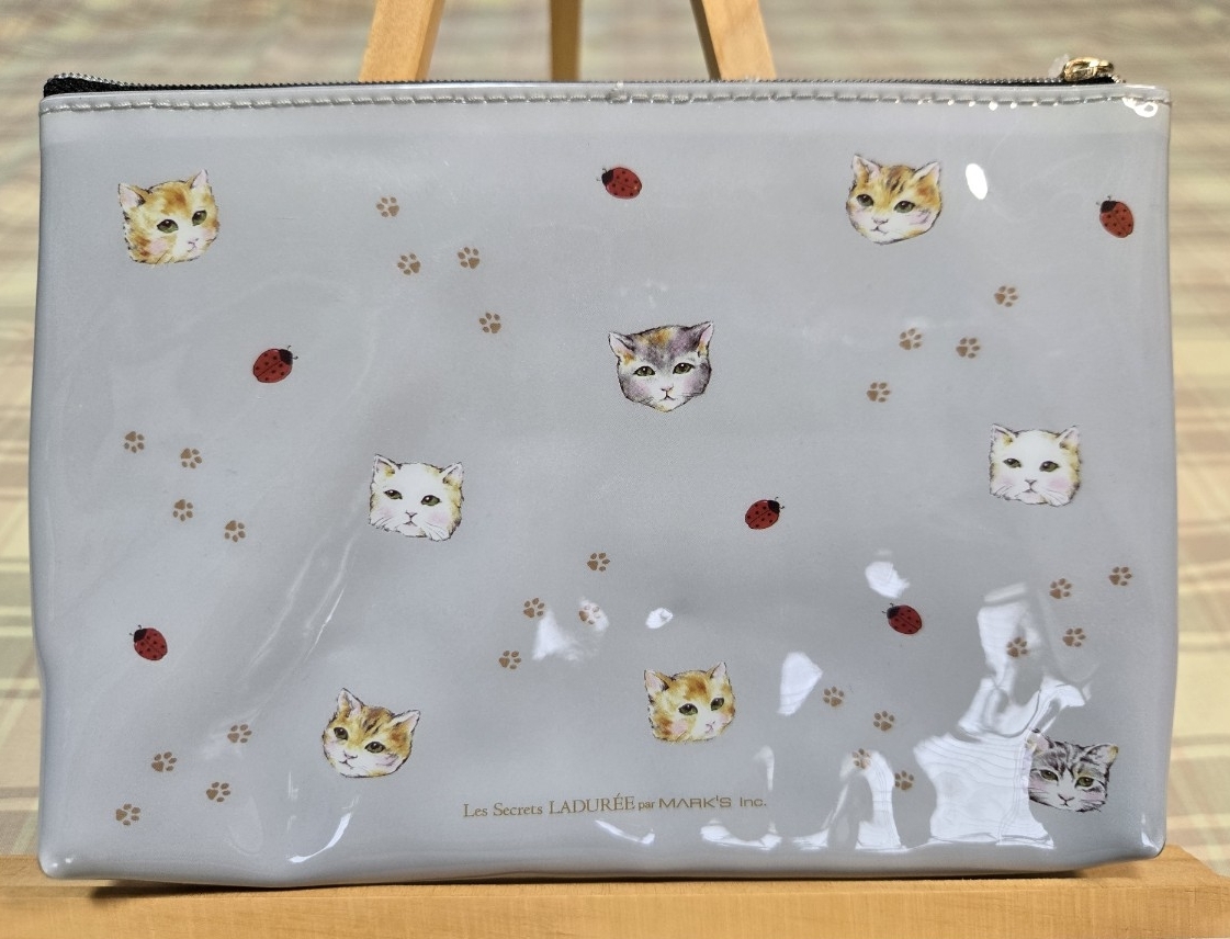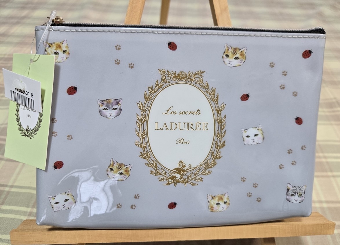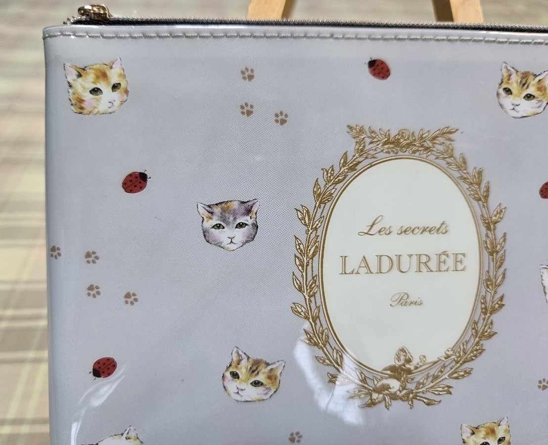 ♪スクレ・ラデュレ♪LADUREE♪キャット柄♪ロゴ入り♪フラットポーチ♪グレー