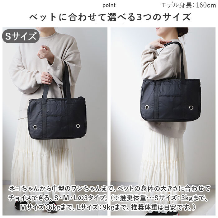 商品説明 | ・・パッと見はシンプルなボックス型トート♪ペットとのお出掛けに便利な2WAYペットキャリー。 ・【通気性の高い安心構造】 ・前後4つの大きな通気孔と、バッグ天面と右側面のメッシュ窓でしっかりと通気性を確保。蒸し暑さの気になる季節でも快適。 ・【ペットの出入りがスムーズ】 ・天面のメッシュ窓は、ダブルファスナーがコの字型に大きく開いて、ペットの出入りが楽ちん。 ・【ペットの様子が見えて安心】 ・中のペットの様子がつぶさに確認でき、ペットからも外が眺められるから、人見知りのワンちゃん・ネコちゃんもリラックス。 ・【小窓には目隠しフラップ付き】 ・右側面のメッシュ小窓は、暑さが気になる季節にはフラップをクルっとロールアップ。外の視線が気になる時にはクローズすることが可能。 ・【飛び出し防止ストラップ】 ・バッグ内側には、リードとつなげるフック付きバンドストラップを搭載し、ペットの急な飛び出しを防止! ・【姿勢が安定してリラックス】 ・移動中にバッグが型崩れしにくく、ペットが安定した状態でくつろげる底敷き板付き。 ・【小物用ポケットも装備】 ・バッグの左側面には、お気に入りのおやつやマナーウェアの持ち歩きに便利なメッシュポケット付き。正面のオープンポケットは、飼い主さん用の小物入れにしてもOK! ・【肩掛けもできるハンドル】 ・ハンドルは、サッと肩掛けにしやすい長さに設計。持ち運び時に手のひらに負担の掛かりにくいハンドルカバー付き。 ・【ペットに合わせて選べる3つのサイズ】 ・・ネコちゃんから中型犬まで、ペットの身体の大きさに合わせてチョイスできる、S・M・Lの3タイプ。(※推奨体重・・・Sサイズ:3kgまで、Mサイズ:6kgまで、Lサイズ:9kgまで。推奨体重は目安です。) ・【使わない時はコンパクトに】 ・お出掛けしない時は、スリムに折りたたんで場所をとらずに収納可能! ・【お出掛けが楽しくなるデザイン】 ・杢調生地に黒のメッシュを合わせた、外出先でも目立ちにくいデザイン。ペットと一緒の旅行や動物病院へのお出掛けに最適。(※ブラックのみ、格子状のリップストップ生地を使用しています。) |