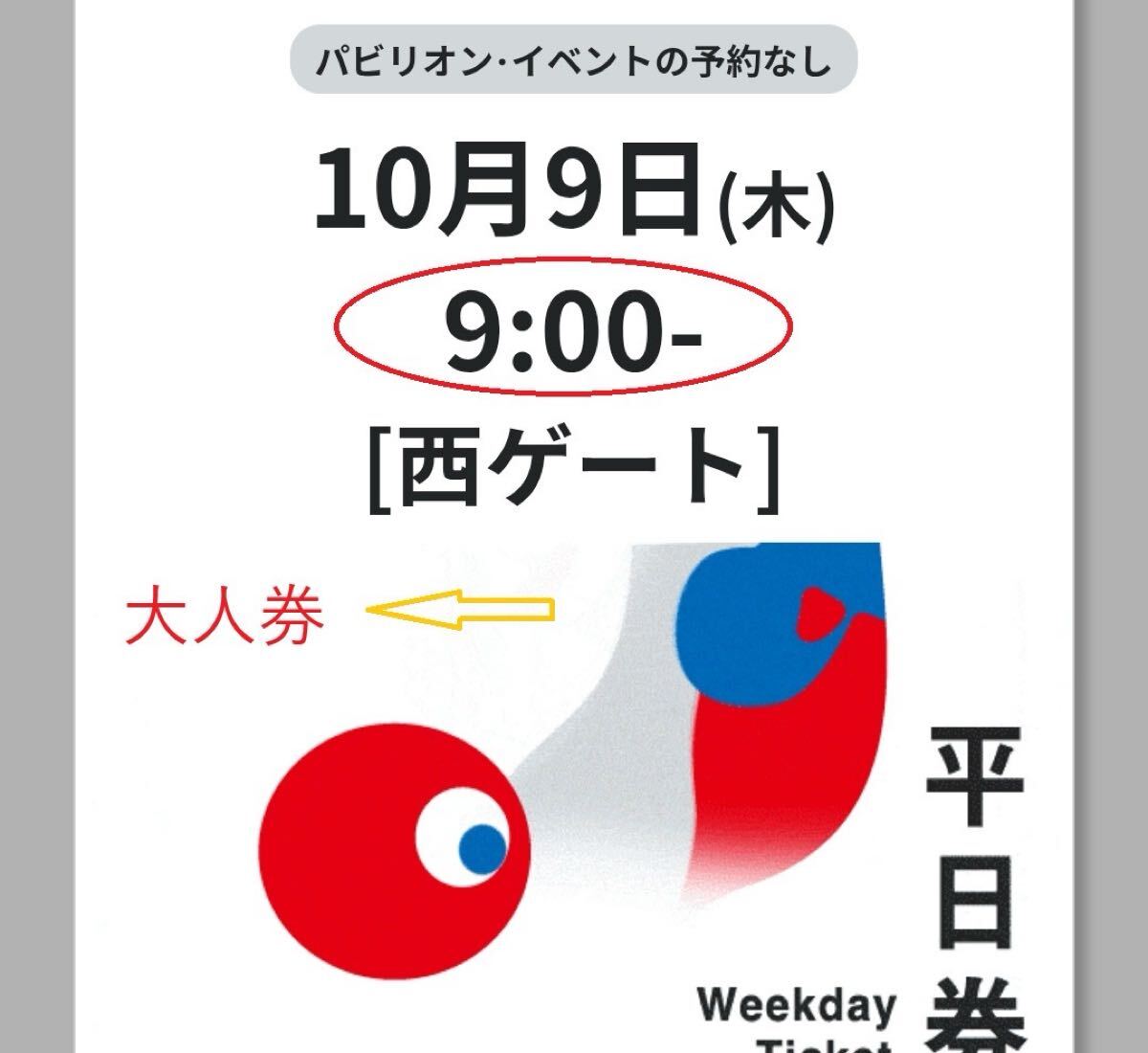 10月9日 9時 木曜日 西ゲート 1枚 大人券